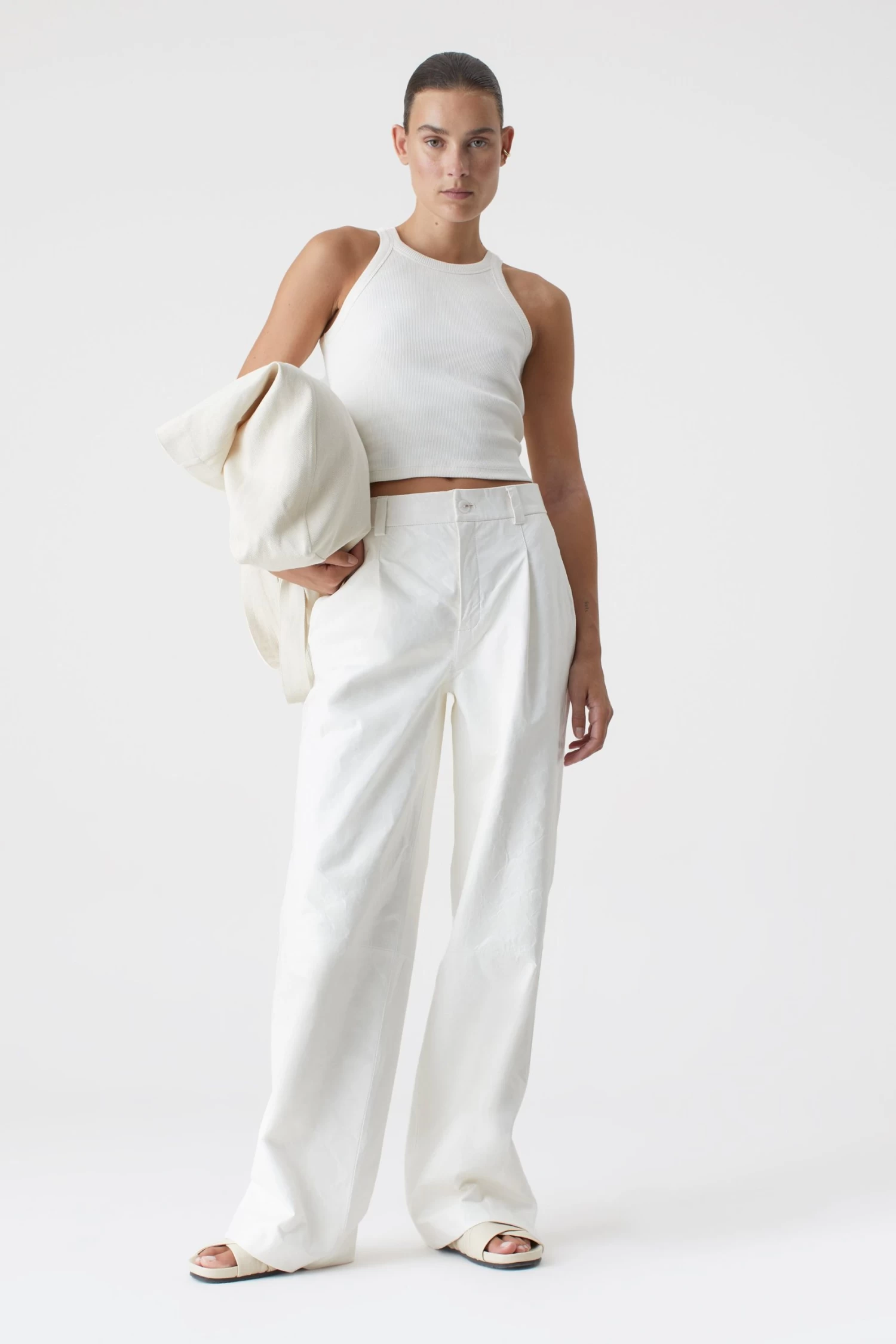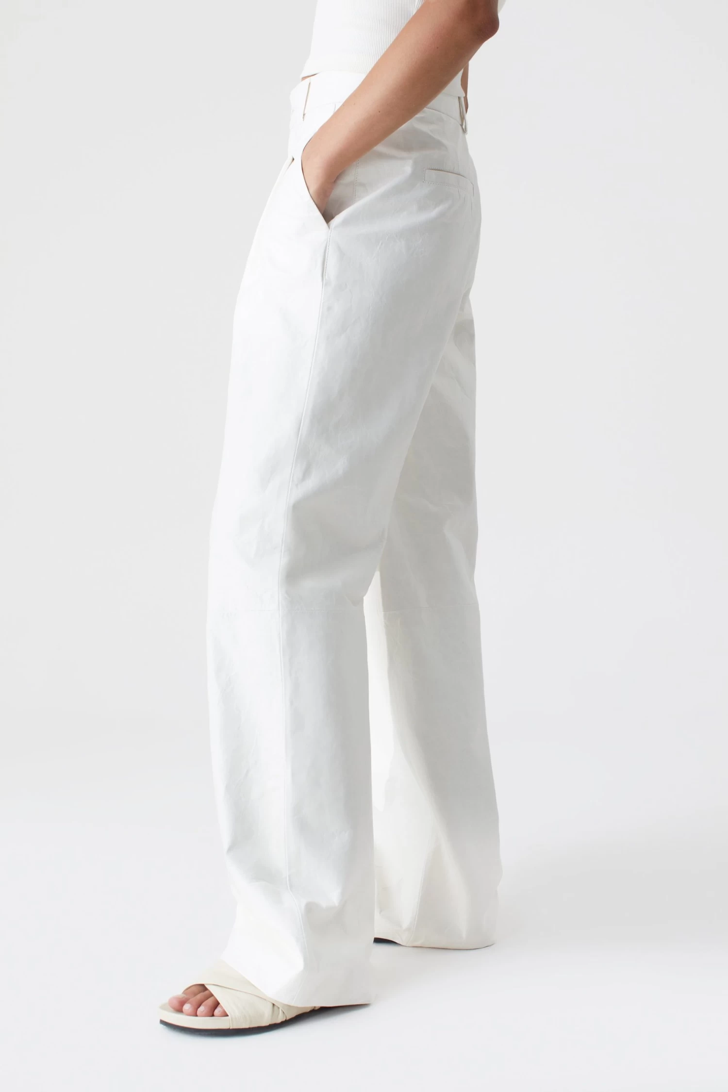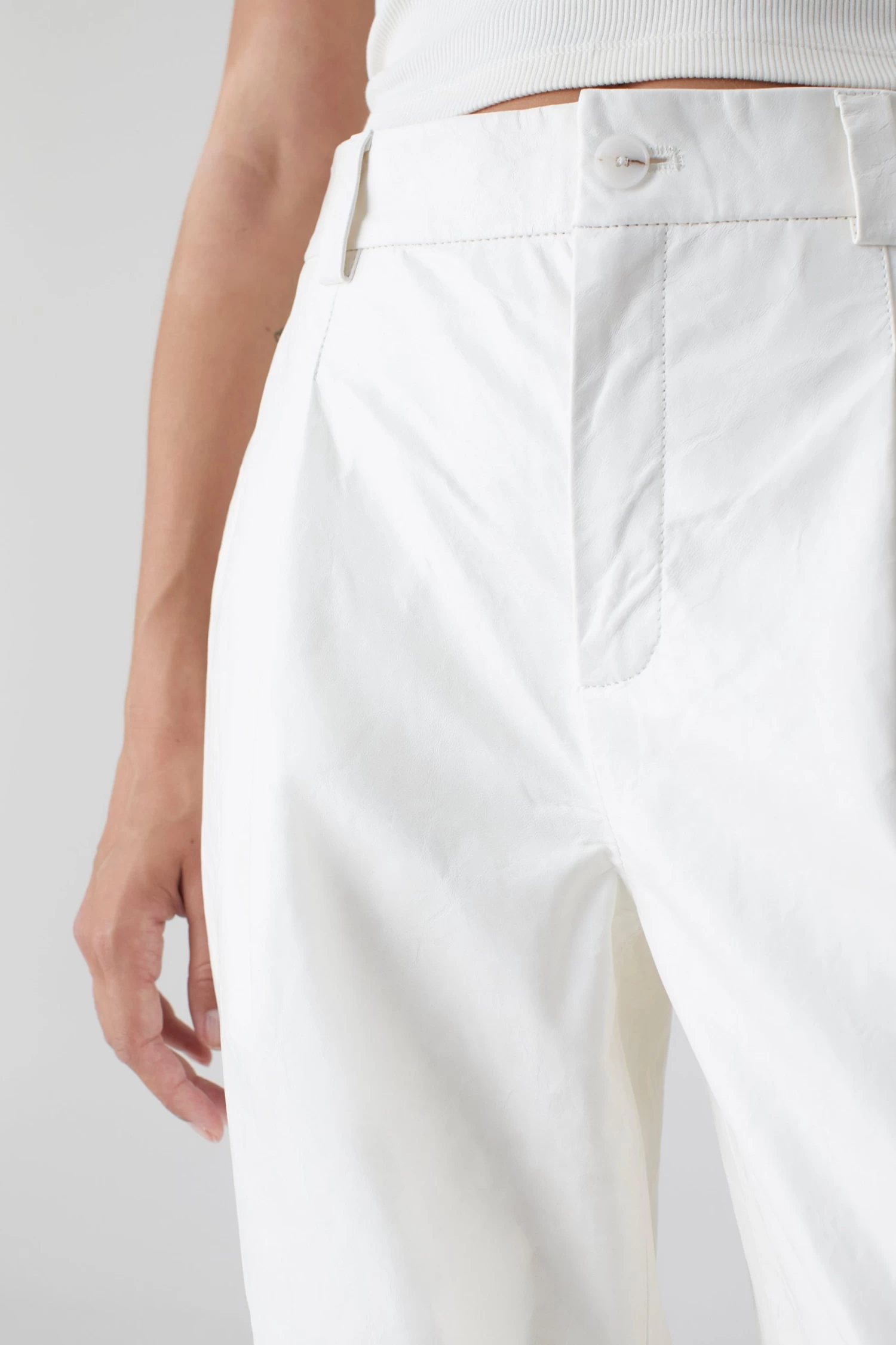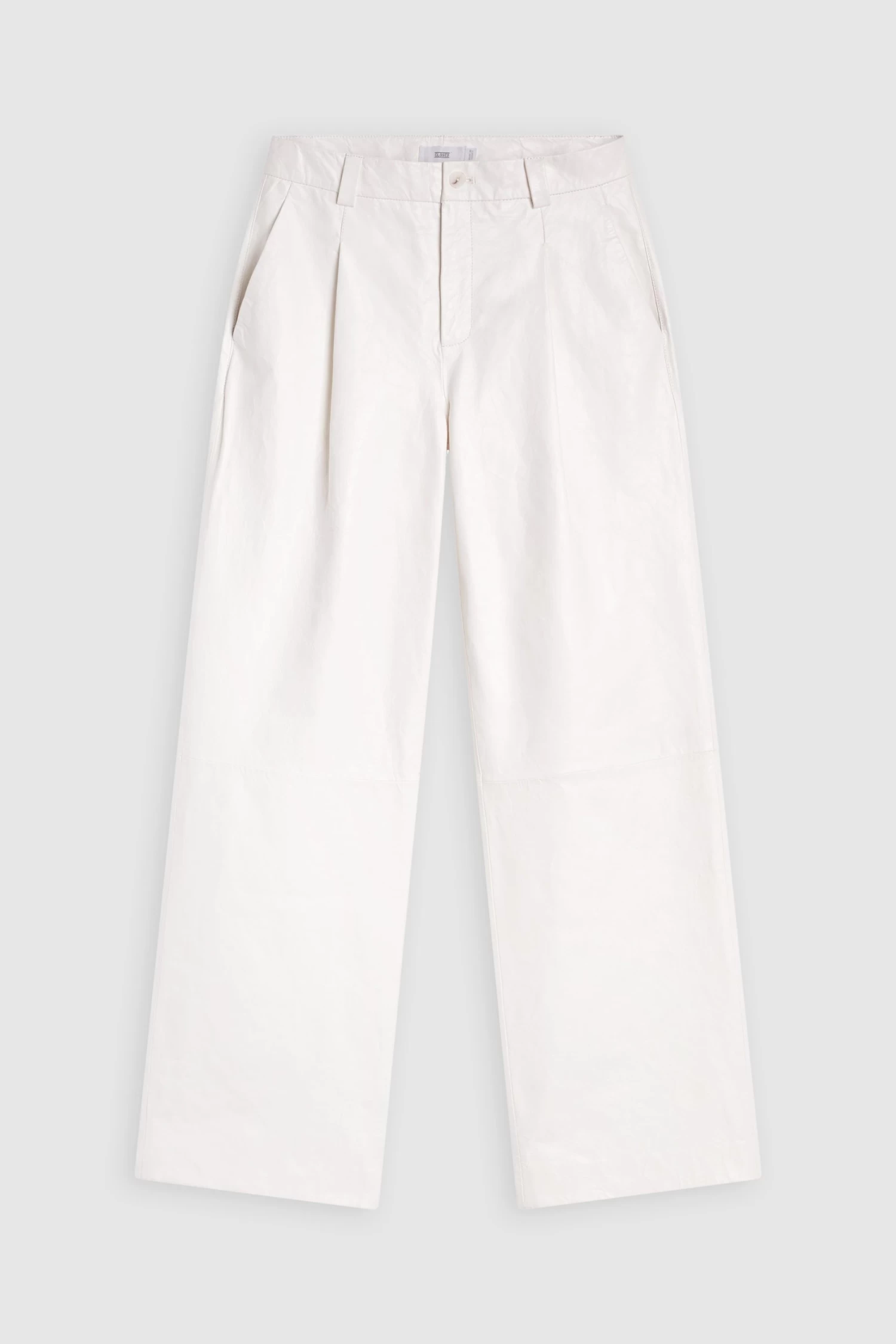 New Relaxed Fit aus shiny Leder mit Crinkle-Effekt und Paper-Touch. Gefertigt bei unseren Spezialist:innen für Lederbekleidung. Style Brooks mit breitem Bund und Bundfalten, seitlichen Eingrifftaschen sowie Leistentaschen auf der Rückseite.