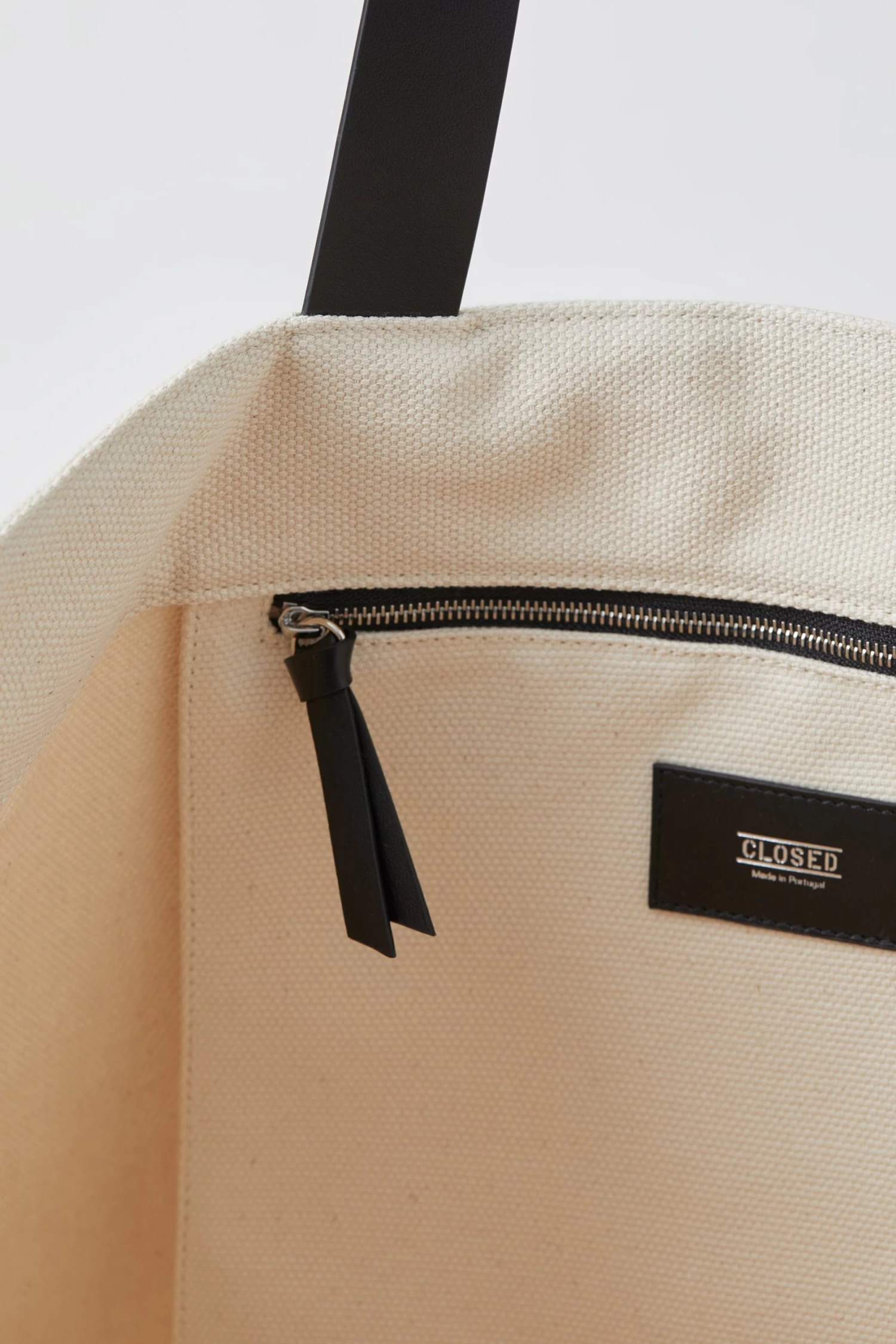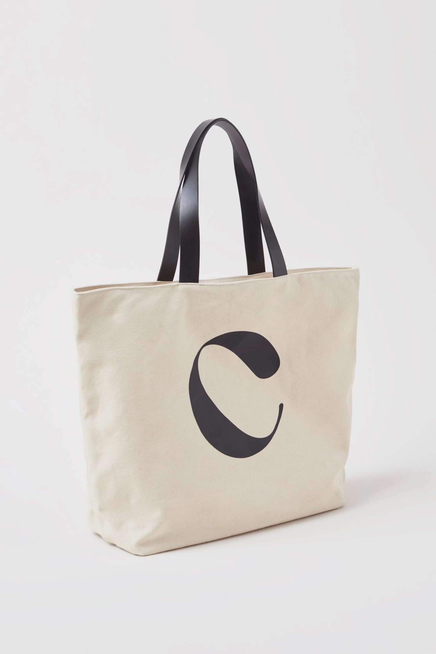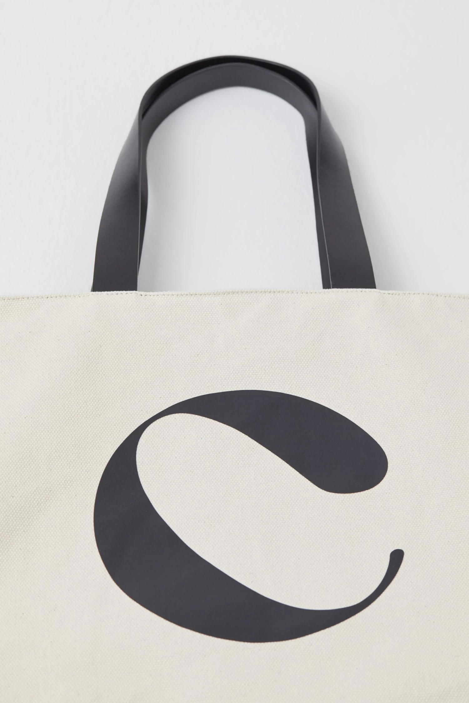Tasche aus kräftigem Baumwoll-Canvas in naturfarbener Optik mit C-Print, Leder-Trageriemen und Leder-Details sowie mit Zipper-Fach innen.