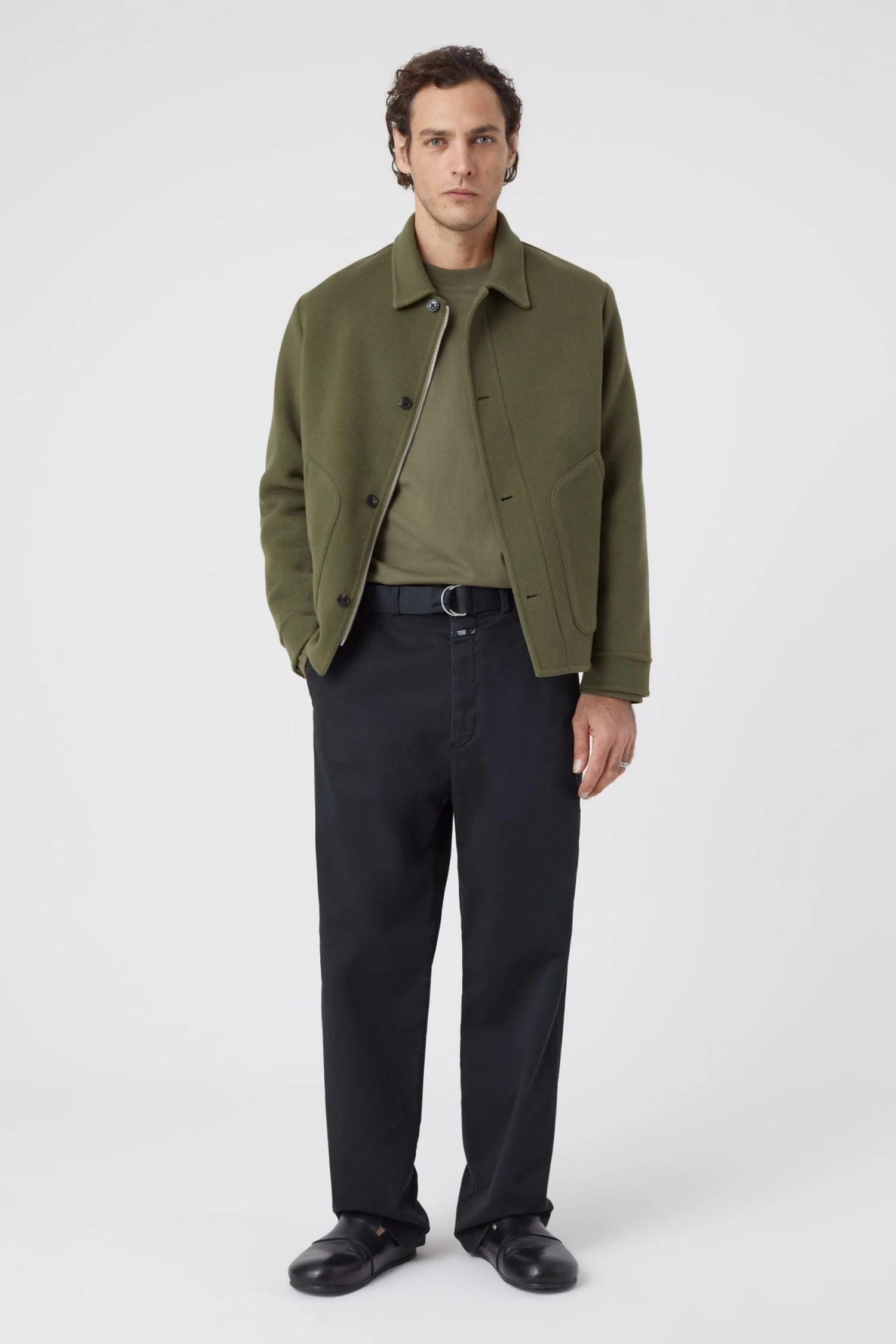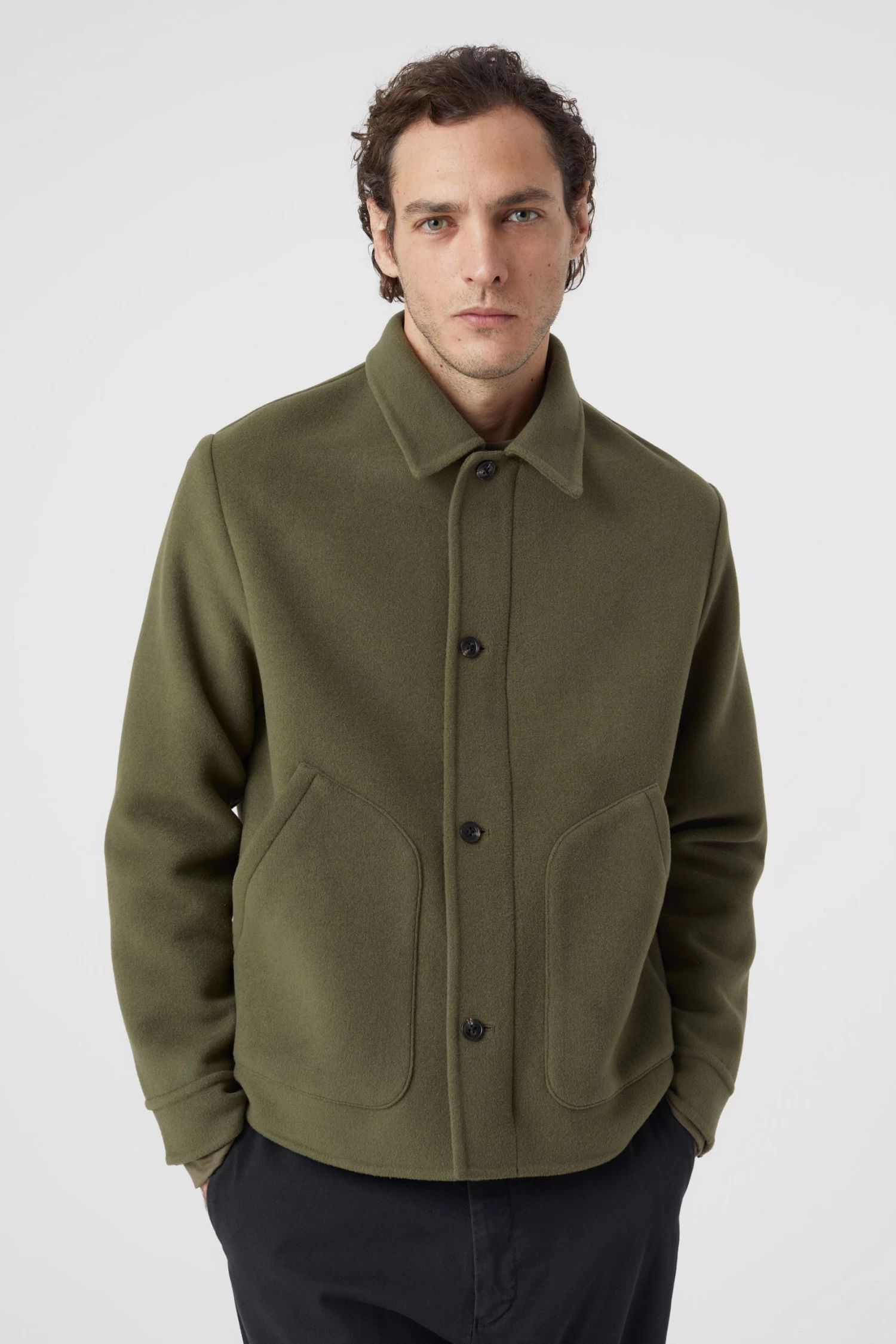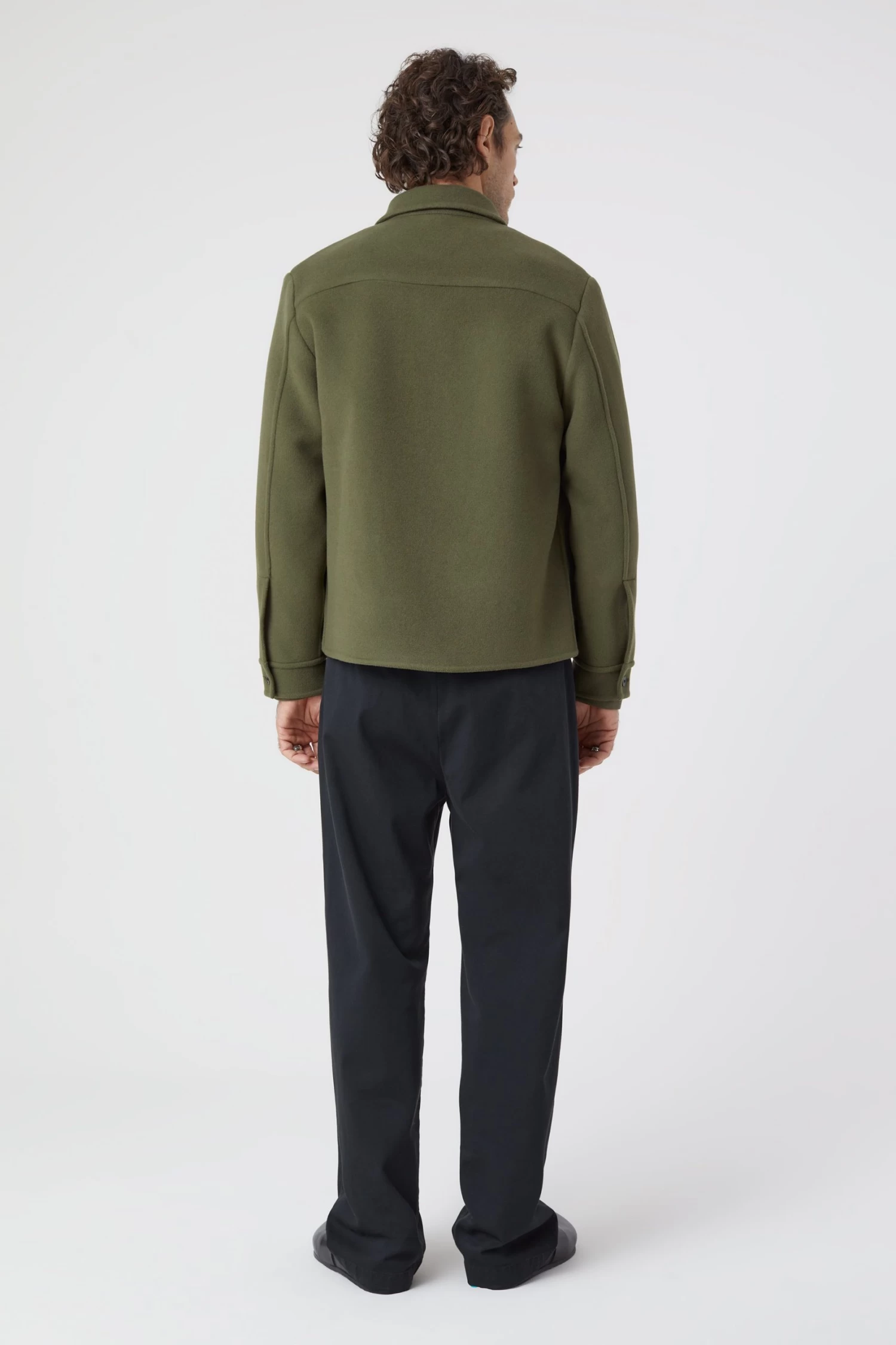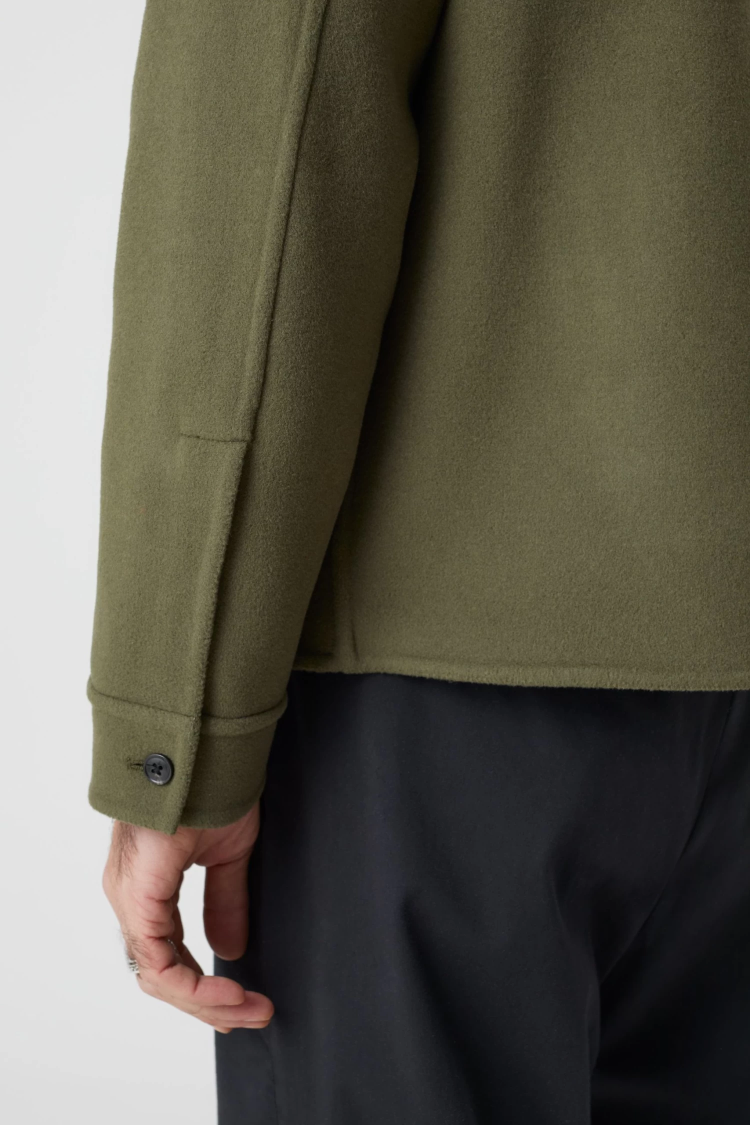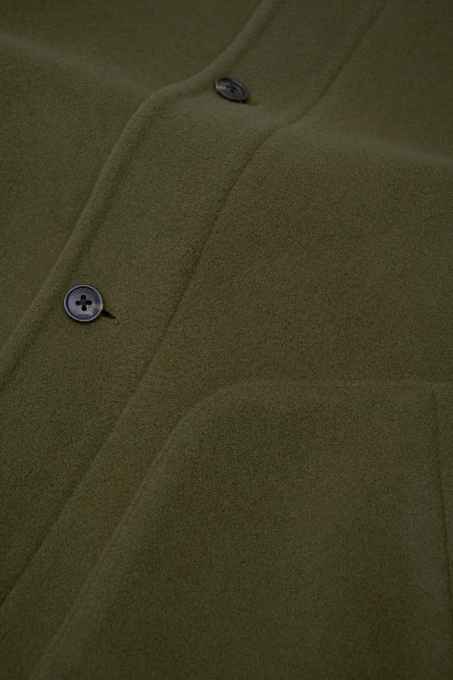 Jacke mit durchgehender Knopfleiste und Zipper aus sehr weichem italienischem Doubleface mit Kaschmir-Anteil. Die Verarbeitung des zweilagigen Stoffs benötigt viel Erfahrung, damit die Kleidungsstücke auch offen getragen gut aussehen. Die Kanten wurden zum Teil von Hand zusammengenäht.