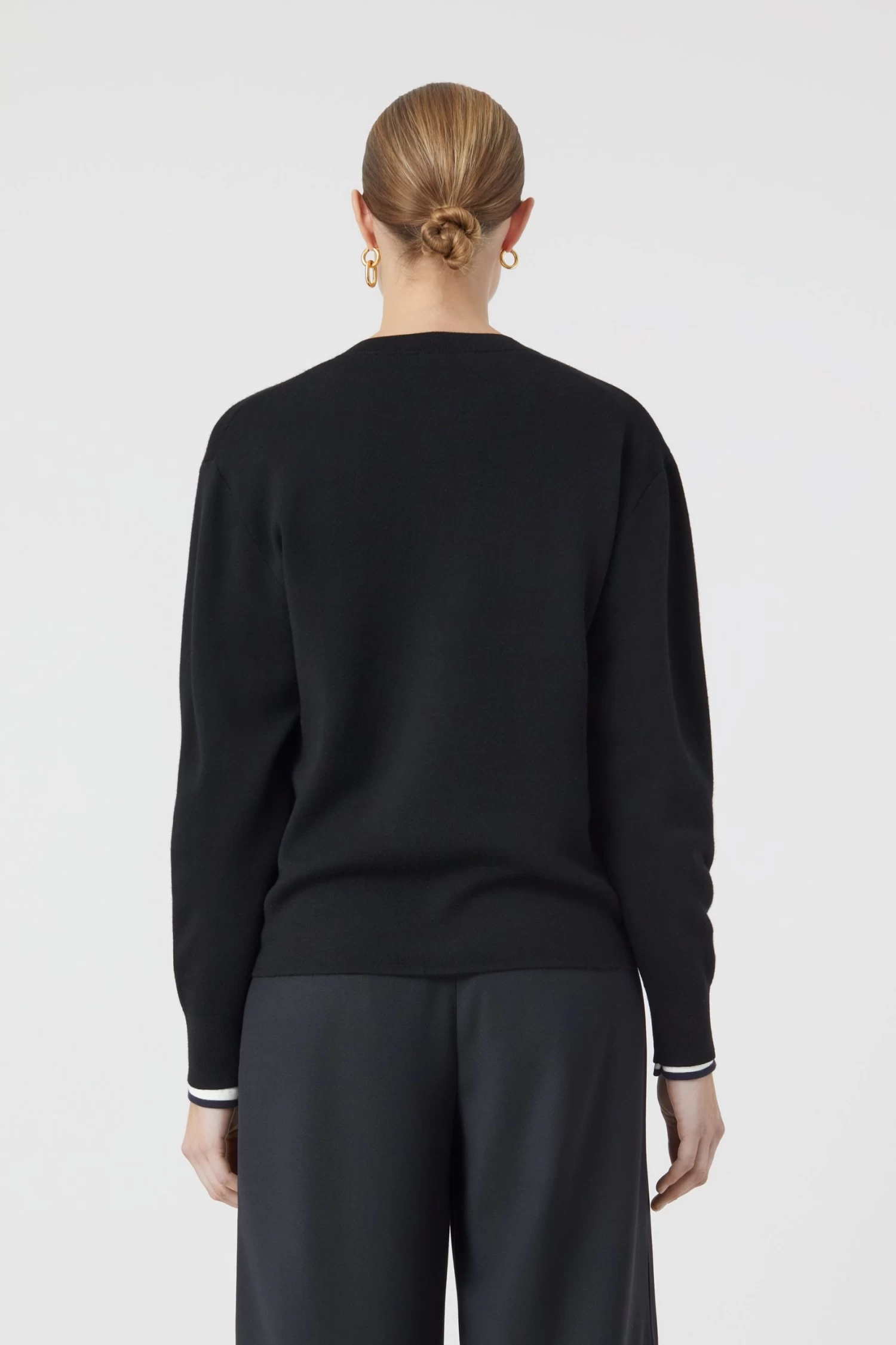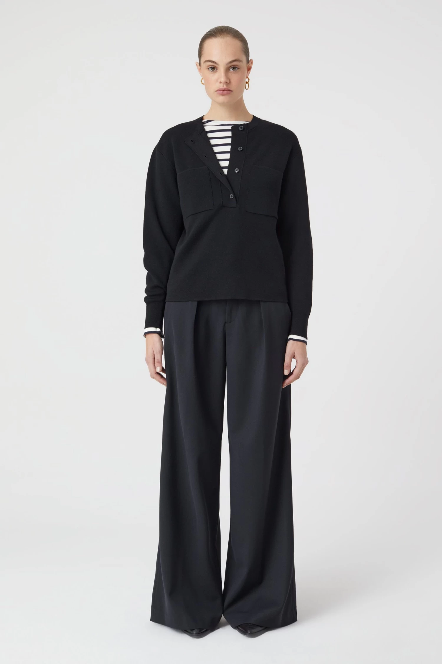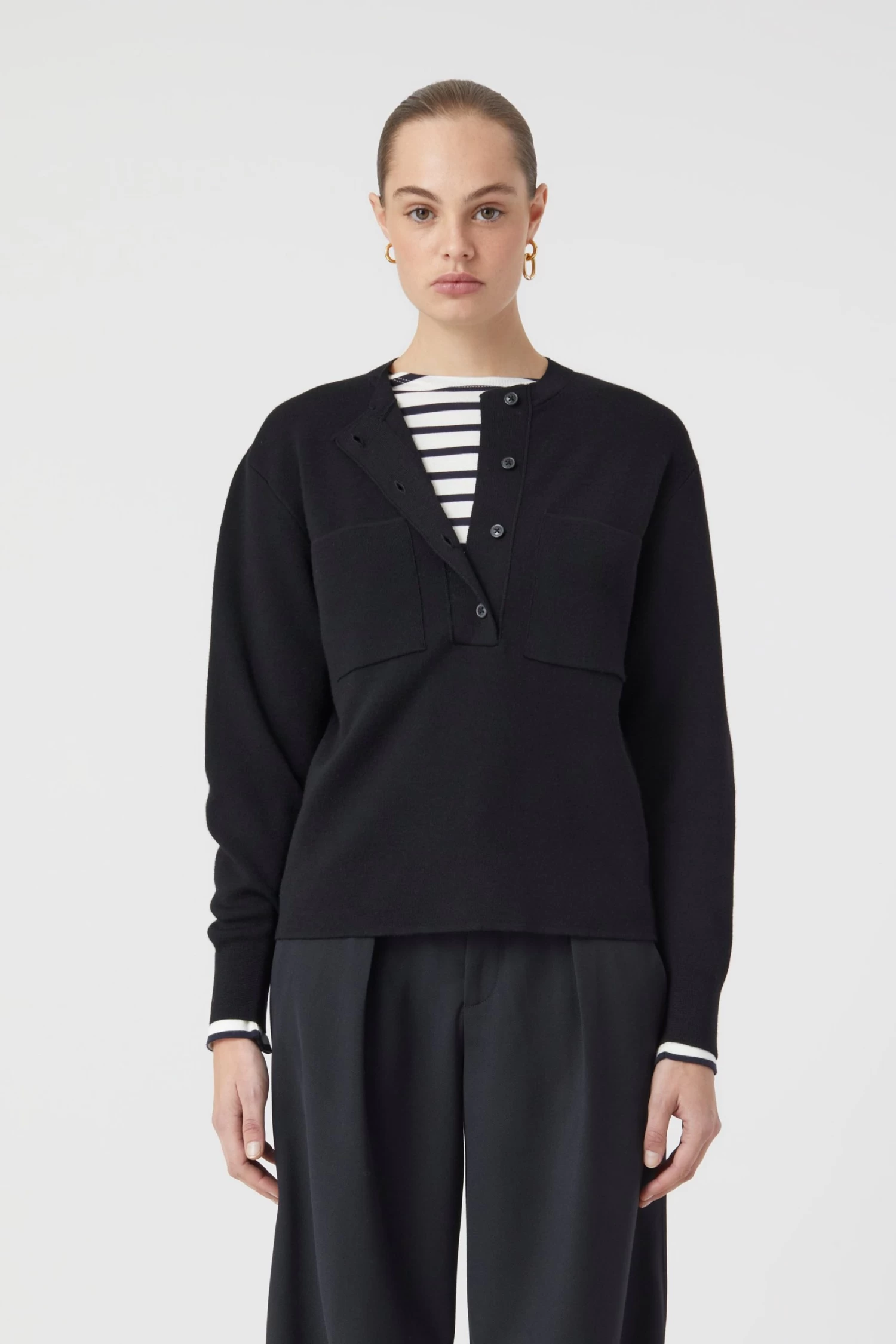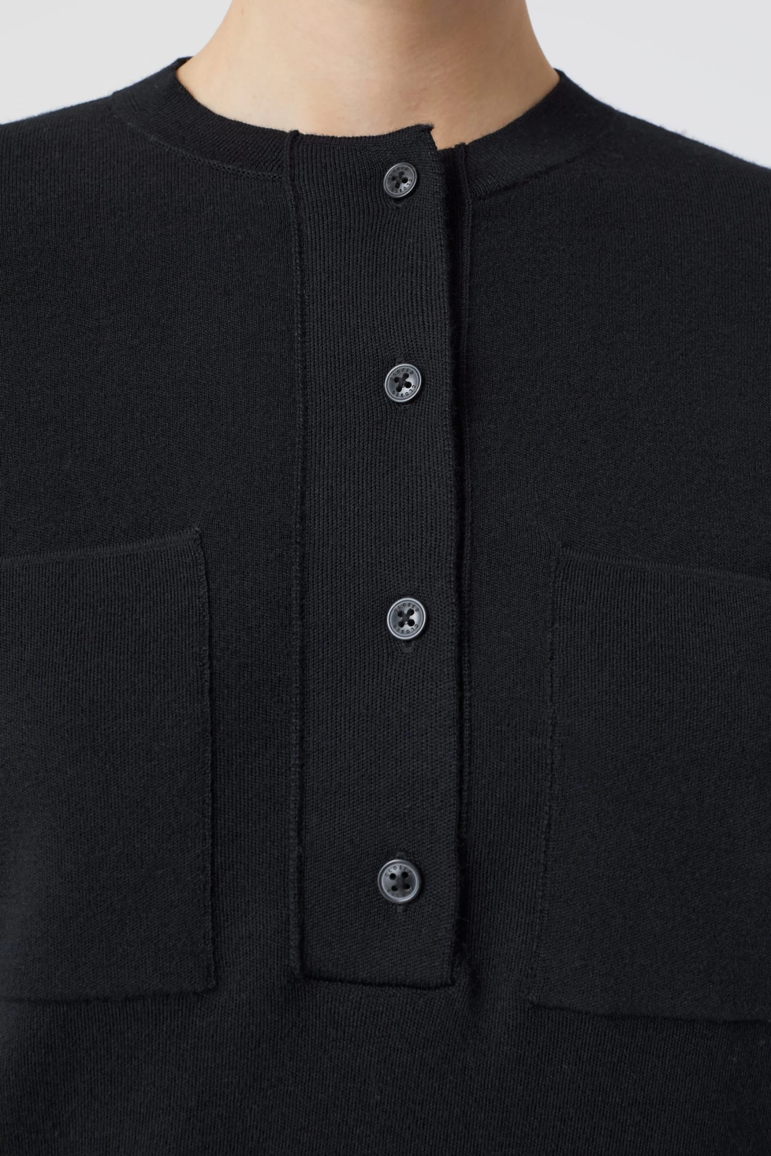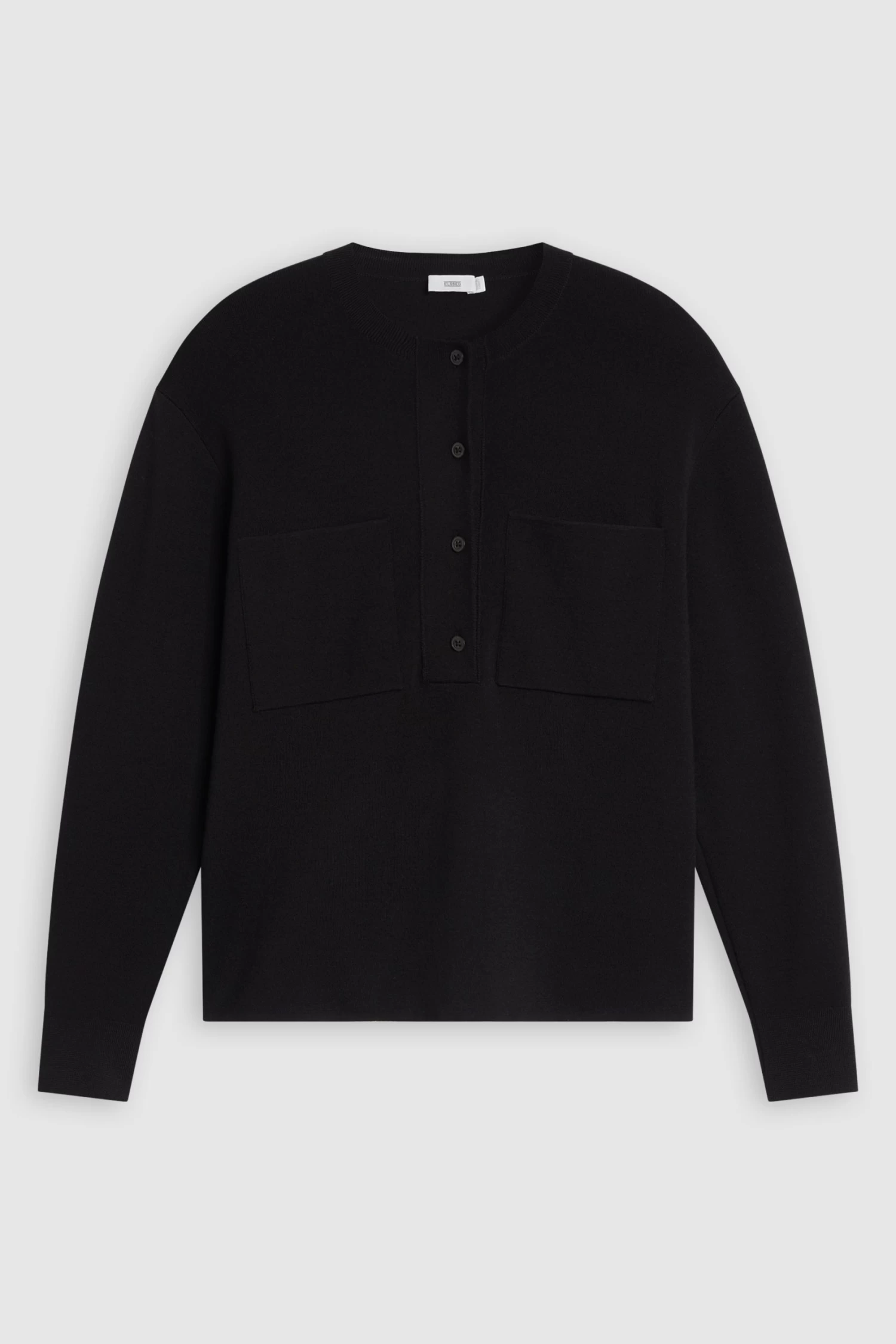 Crewneck aus feinem Bio-Wollstrick mit Knopfleiste und Knöpfen in Horn-Optik. Mit Taschen auf der Brust und geradem Saumabschluss.