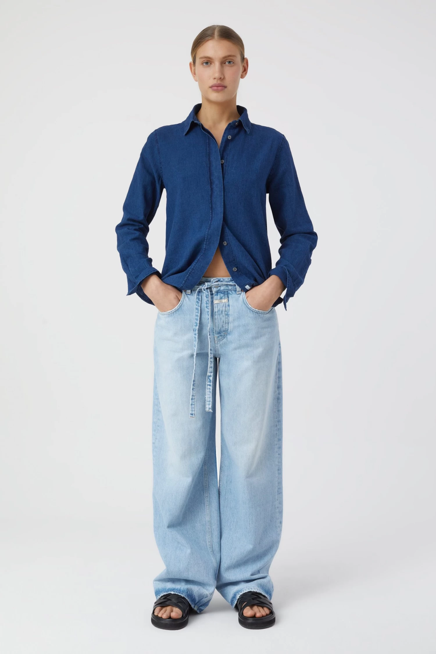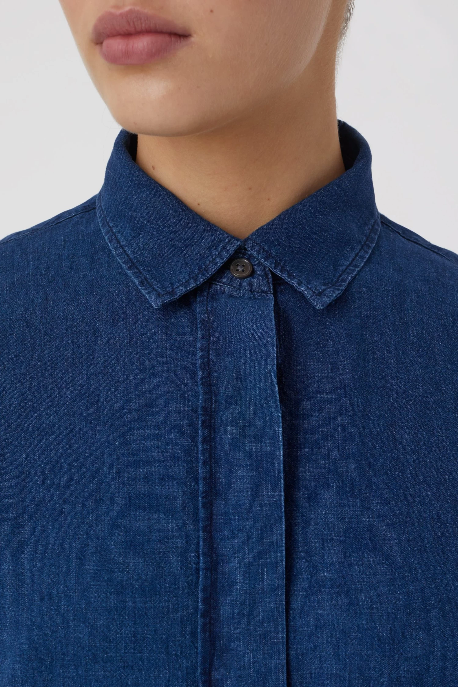 Gefertigt aus leichtem Indigo-gefärbtem Leinen-Baumwolle-Mix mit lebendiger Struktur in gewaschener Optik: Hemdbluse im Regular Fit mit verdeckter Knopfleiste und Perlmuttknöpfen.