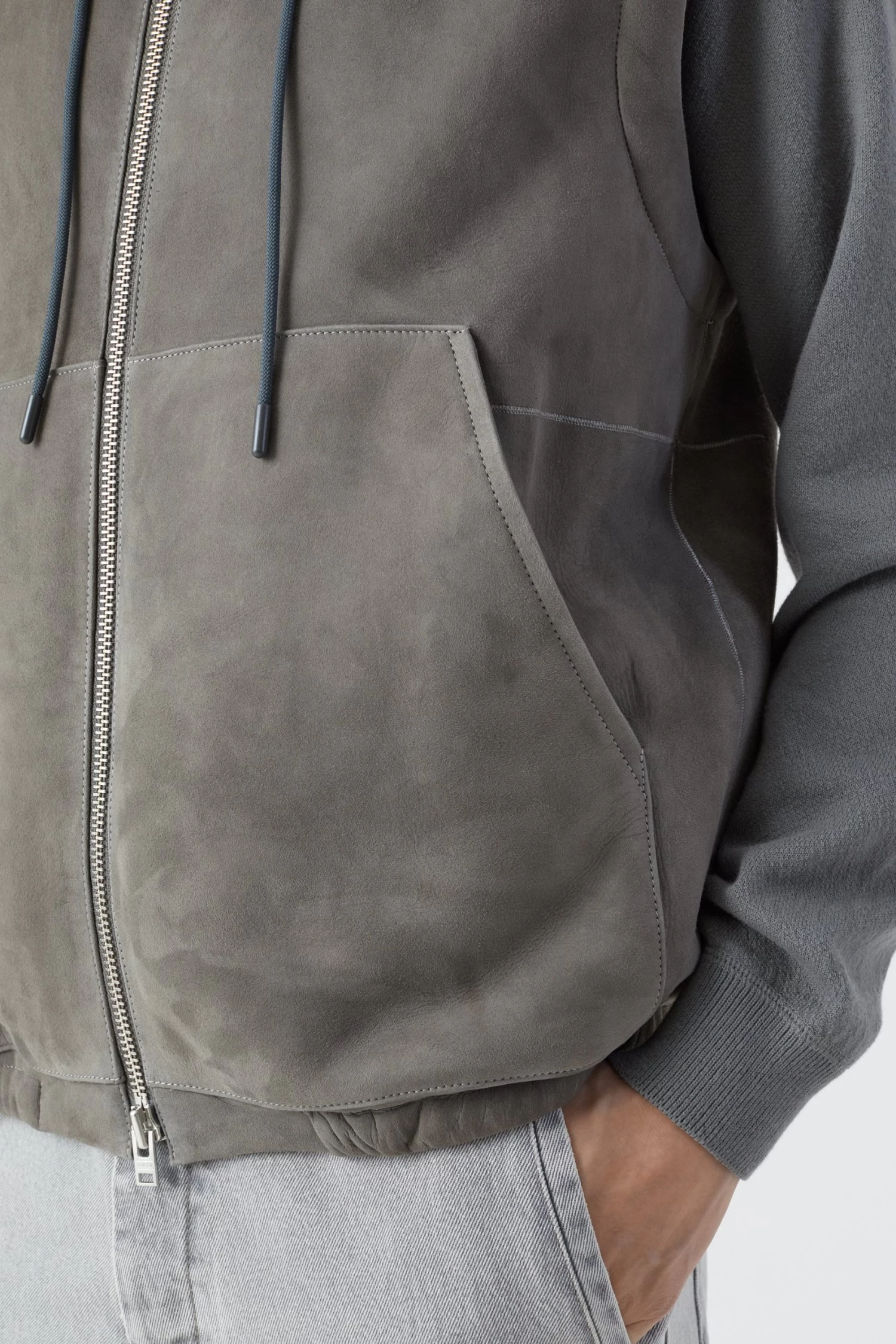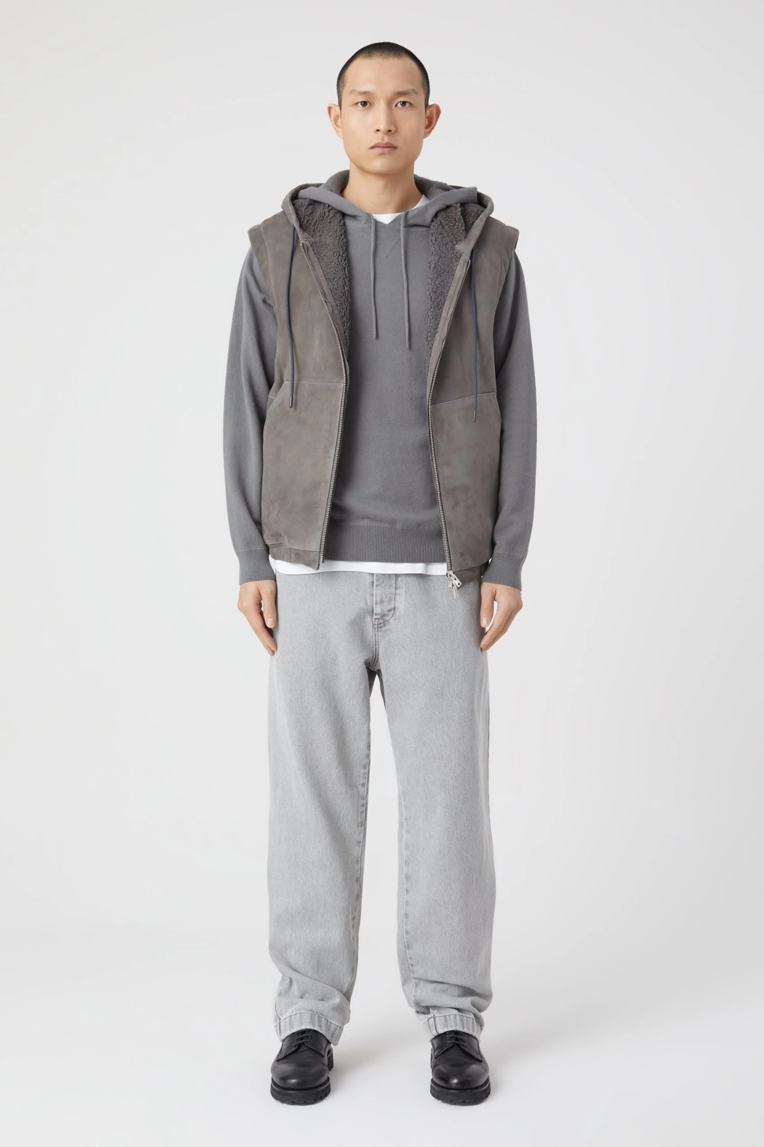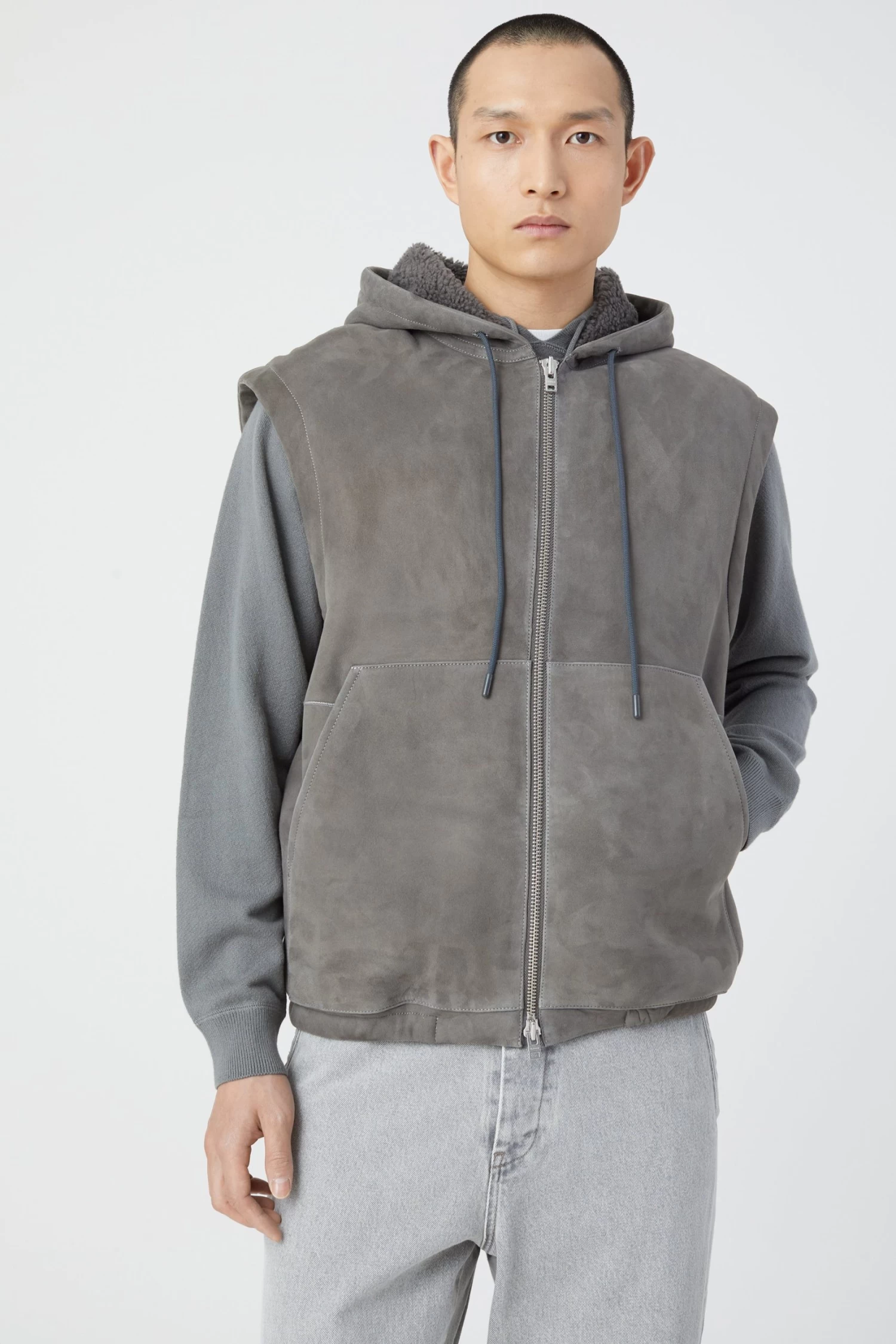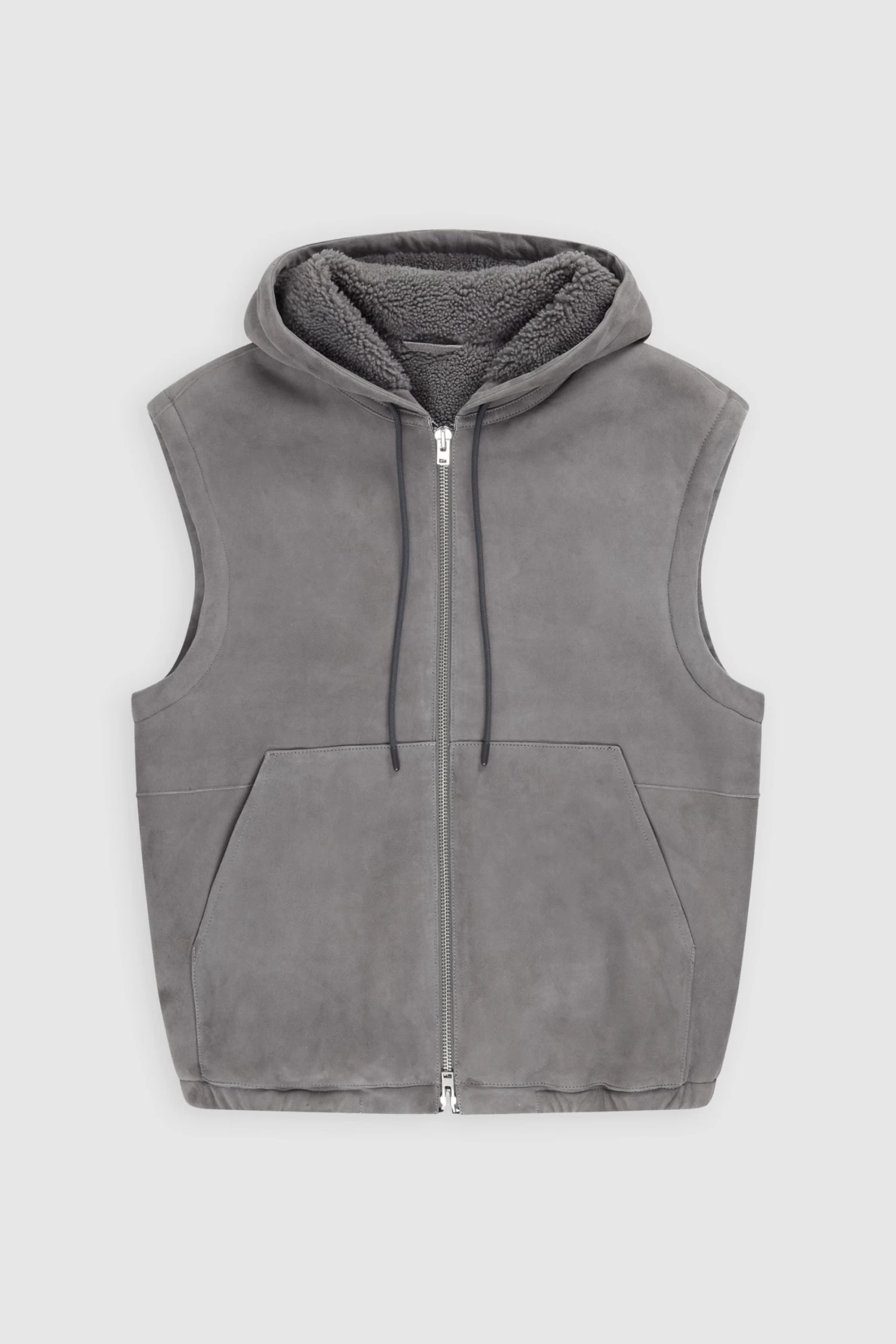 Lang geschnittene Weste aus weichem spanischem Lammfell, gegerbt bei La Doma in der Nähe von Barcelona. Regular Fit mit Tunnelzug in der Kapuze, Zwei-Wege-Zipper aus Metall, Fronttasche und gerade geschnittenem Saum.