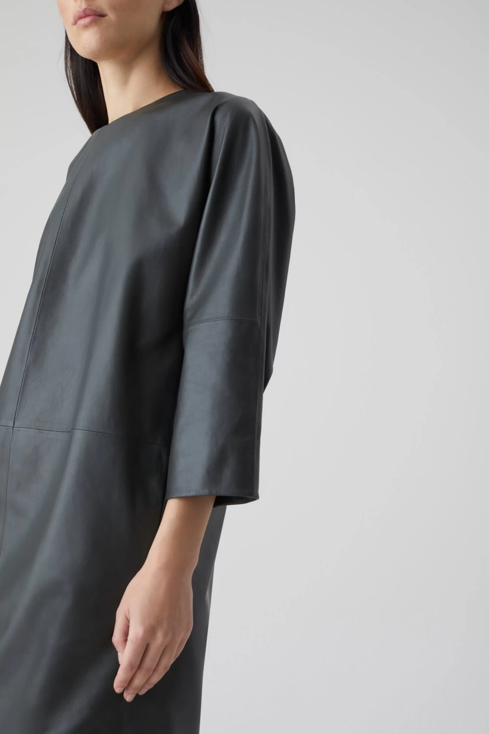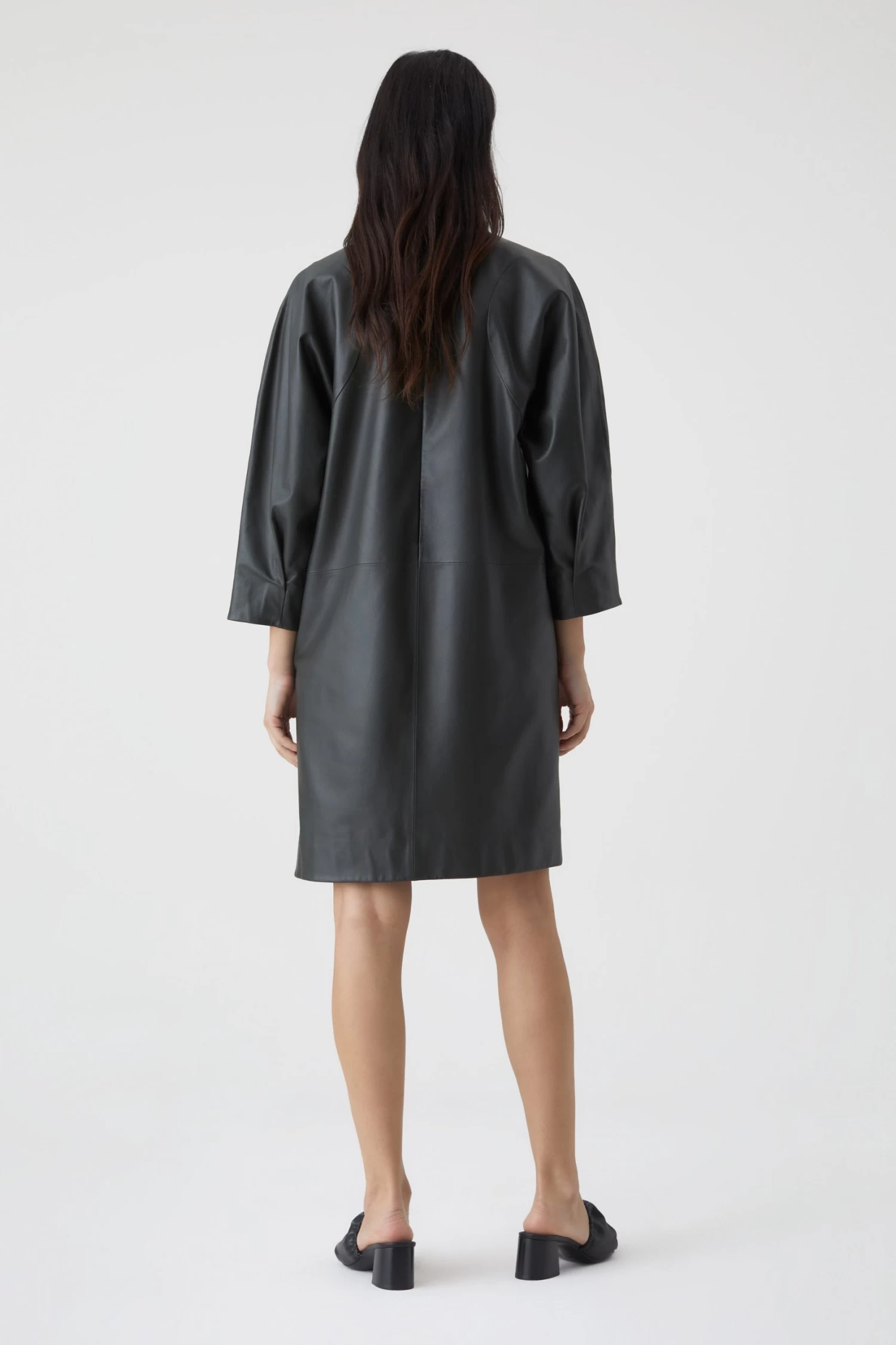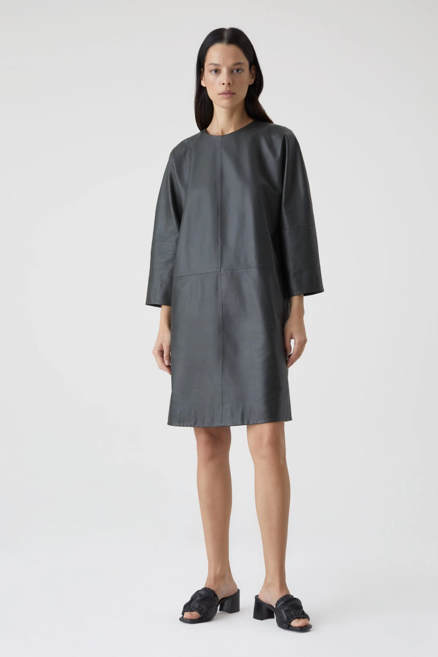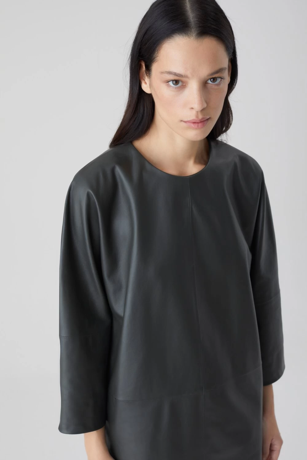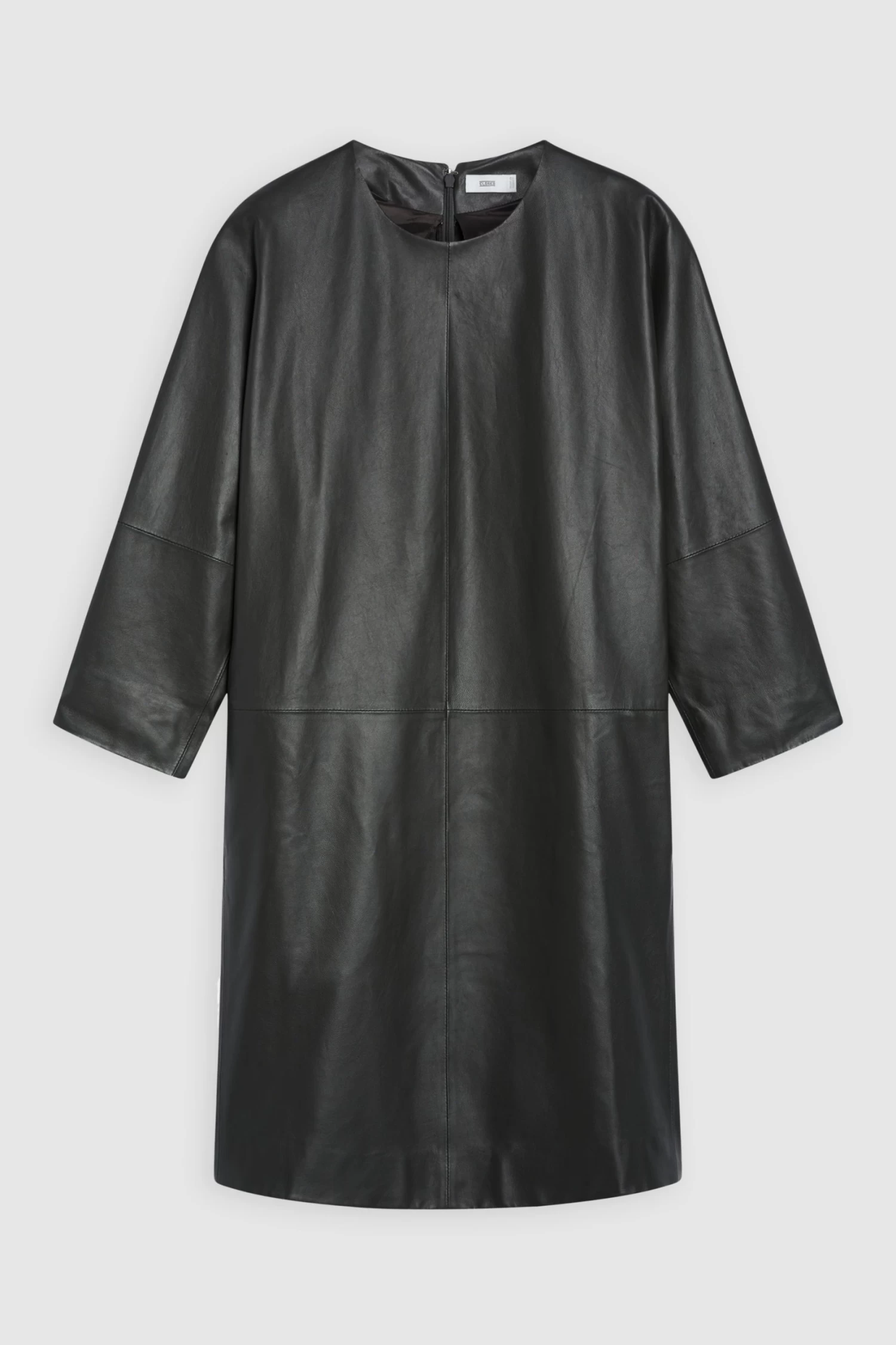 Etuikleid mit Rundhalsausschnitt, weiten Ärmeln in leicht verkürzter Länge und mittigem Zipper auf der Rückseite aus sehr weichem und leichtem Lammleder. Gefüttert mit leichtem Viskosestoff.