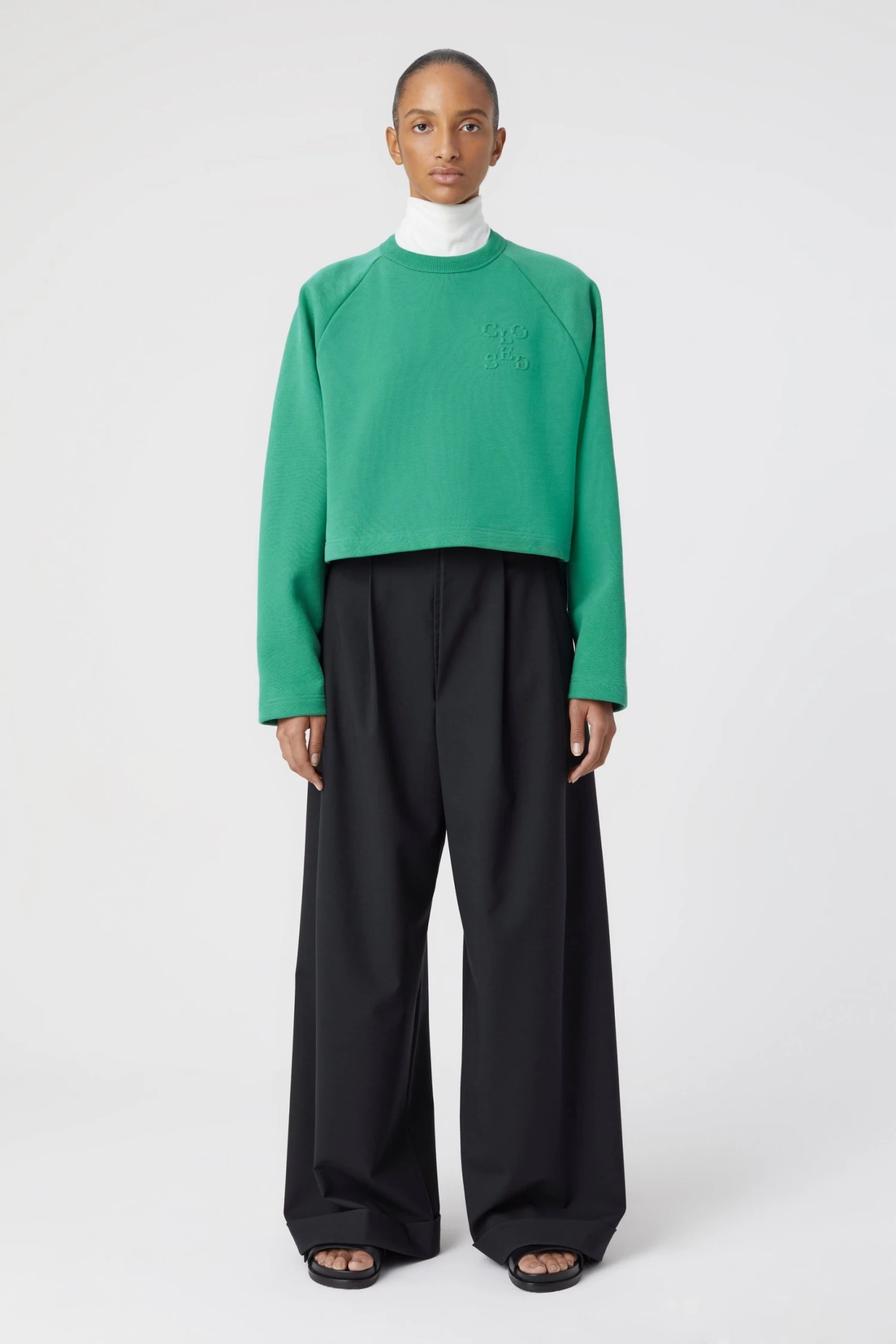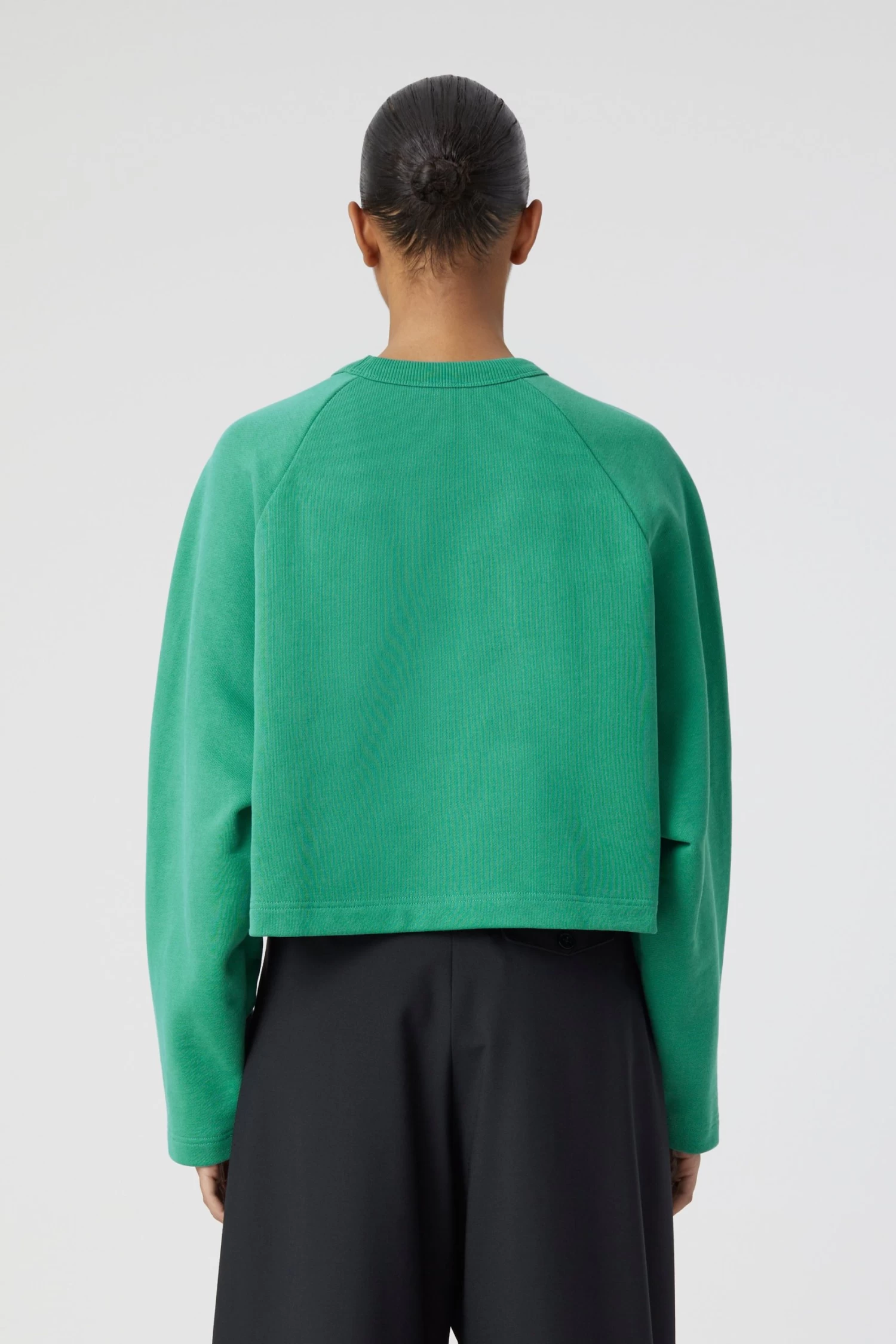 Dieser gecroppte Sweater mit kompaktem Griff besteht aus reiner Bio-Baumwolle. Er hat einen regulären Schnitt und einen klassischen gerippten Rundhalsausschnitt, weit geschnittene Ärmel, einen geraden Saumabschluss und unser Closed Logo auf der Brust.