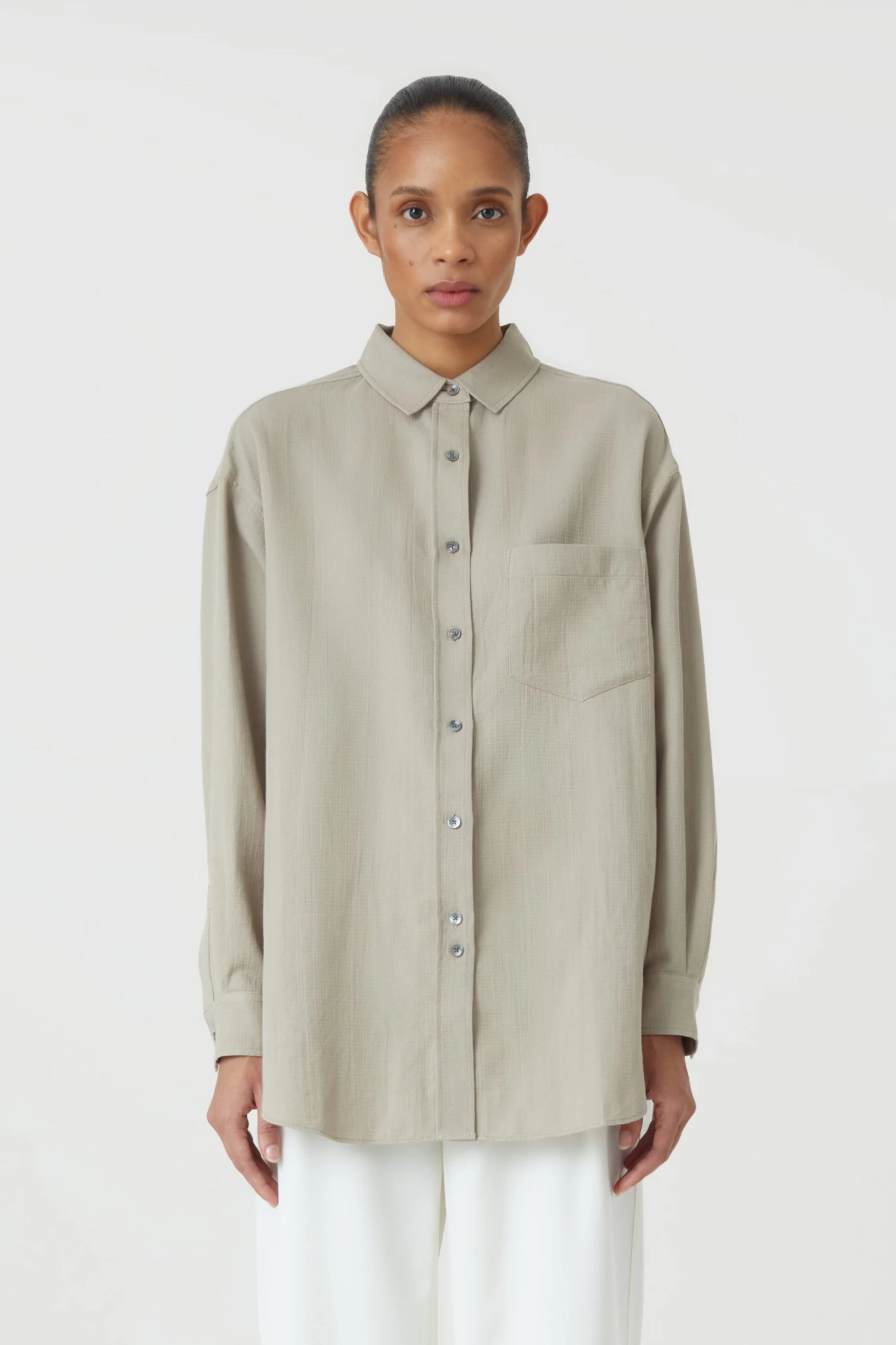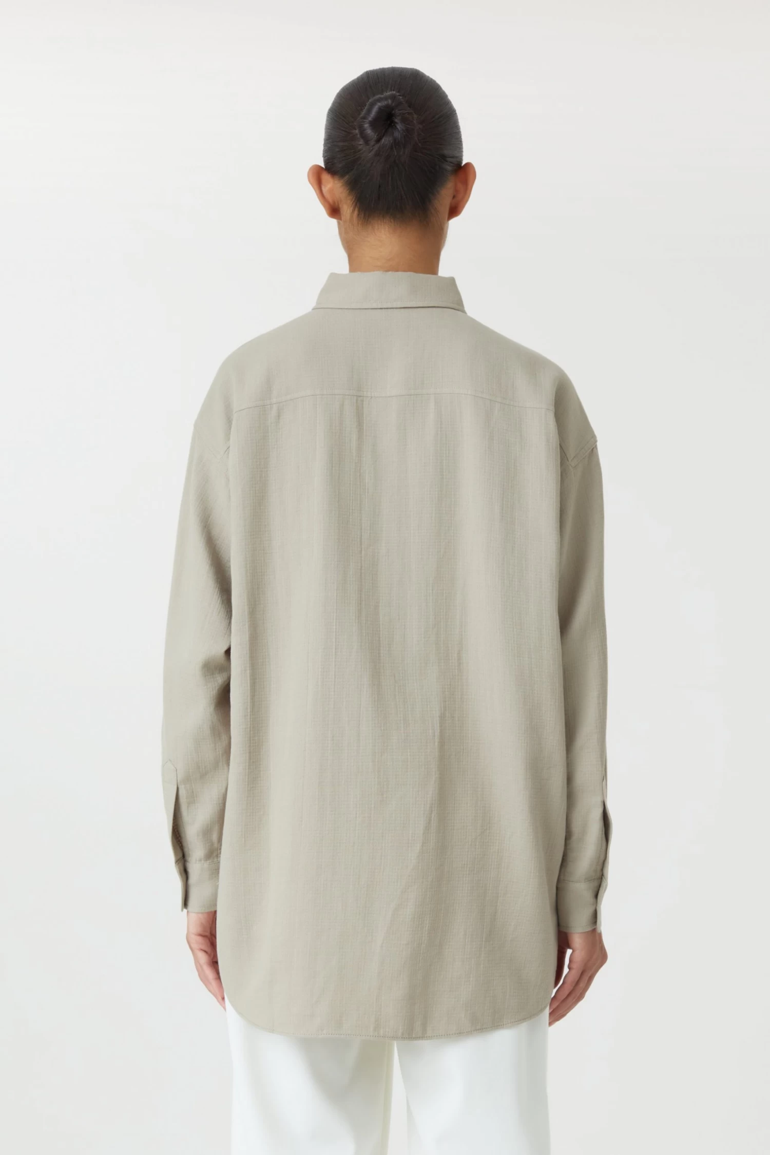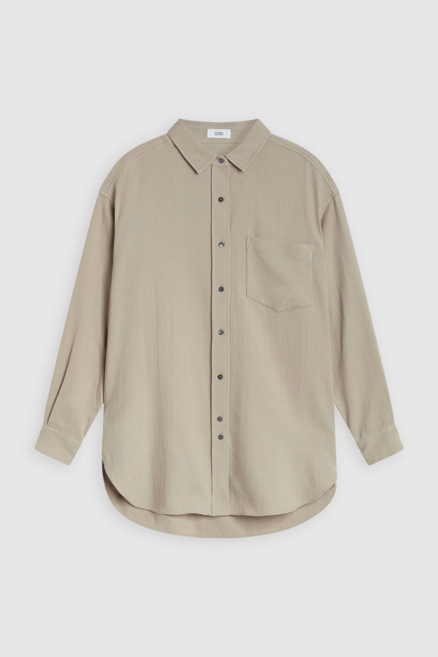 Gefertigt aus strukturiertem und weich fallendem Baumwollstoff: Lang geschnittene Hemdbluse mit durchgehender Knopfleiste, Perlmuttknöpfen, Brusttasche und gerundetem Saum. Auf der Rückseite länger geschnitten.