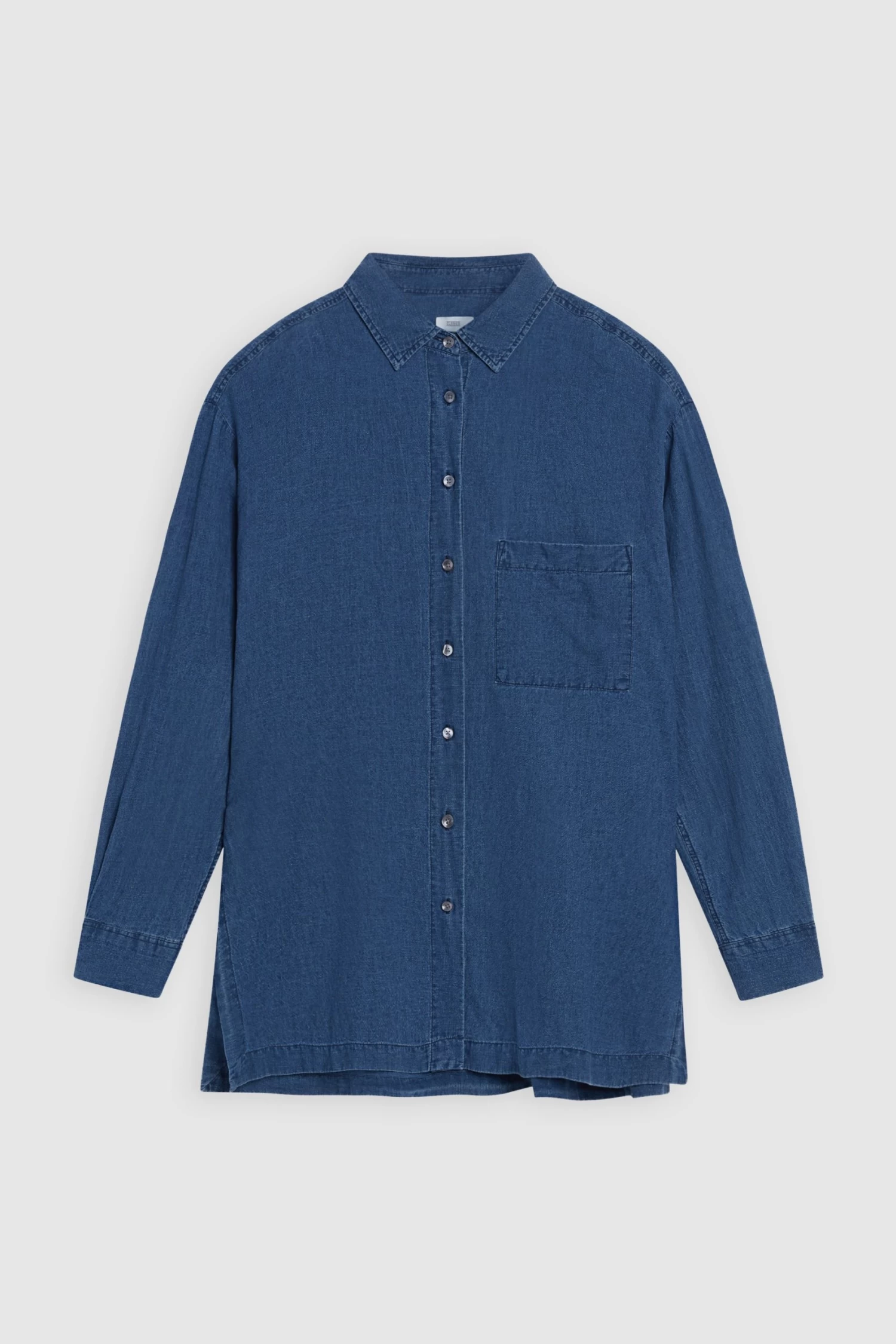 Relaxed Fit mit geradem Saum und Seitenschlitzen: Hemdbluse aus leichtem Indigo-Leinen-Mix mit typisch lebendiger Struktur und weicher Haptik. Brusttasche, lange Ärmel mit Manschetten und Perlmuttknöpfe.