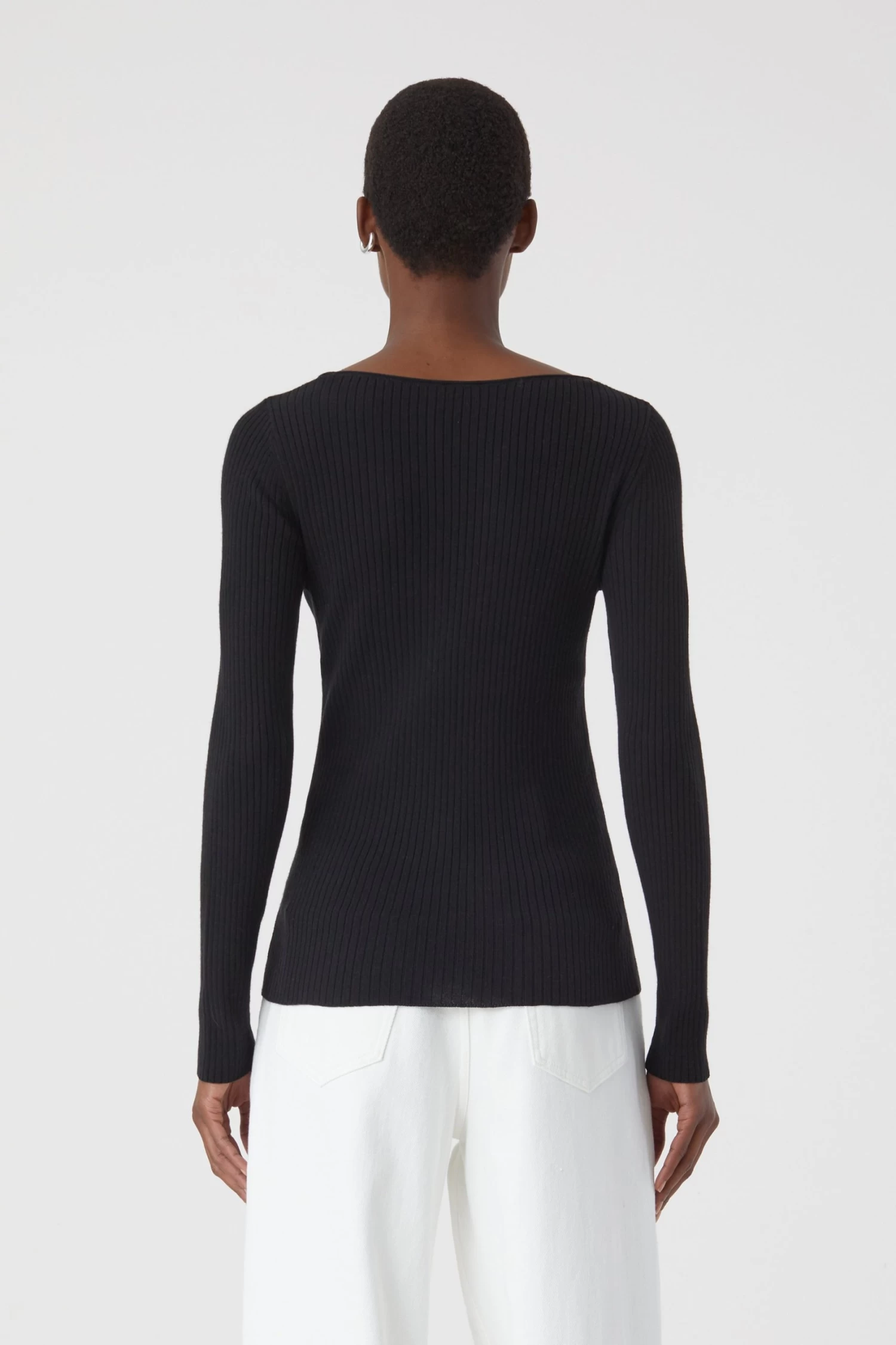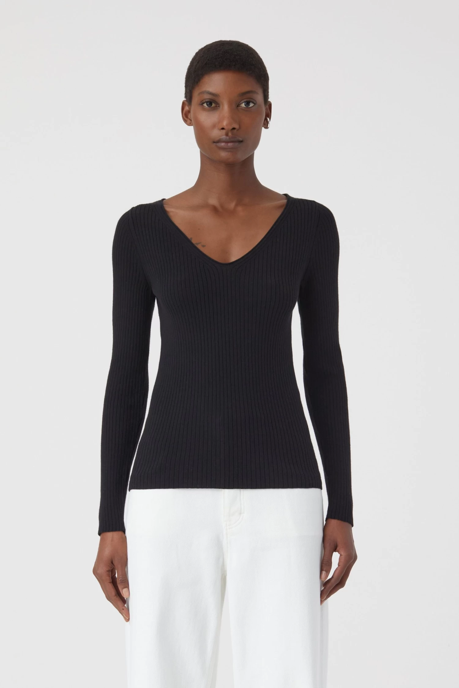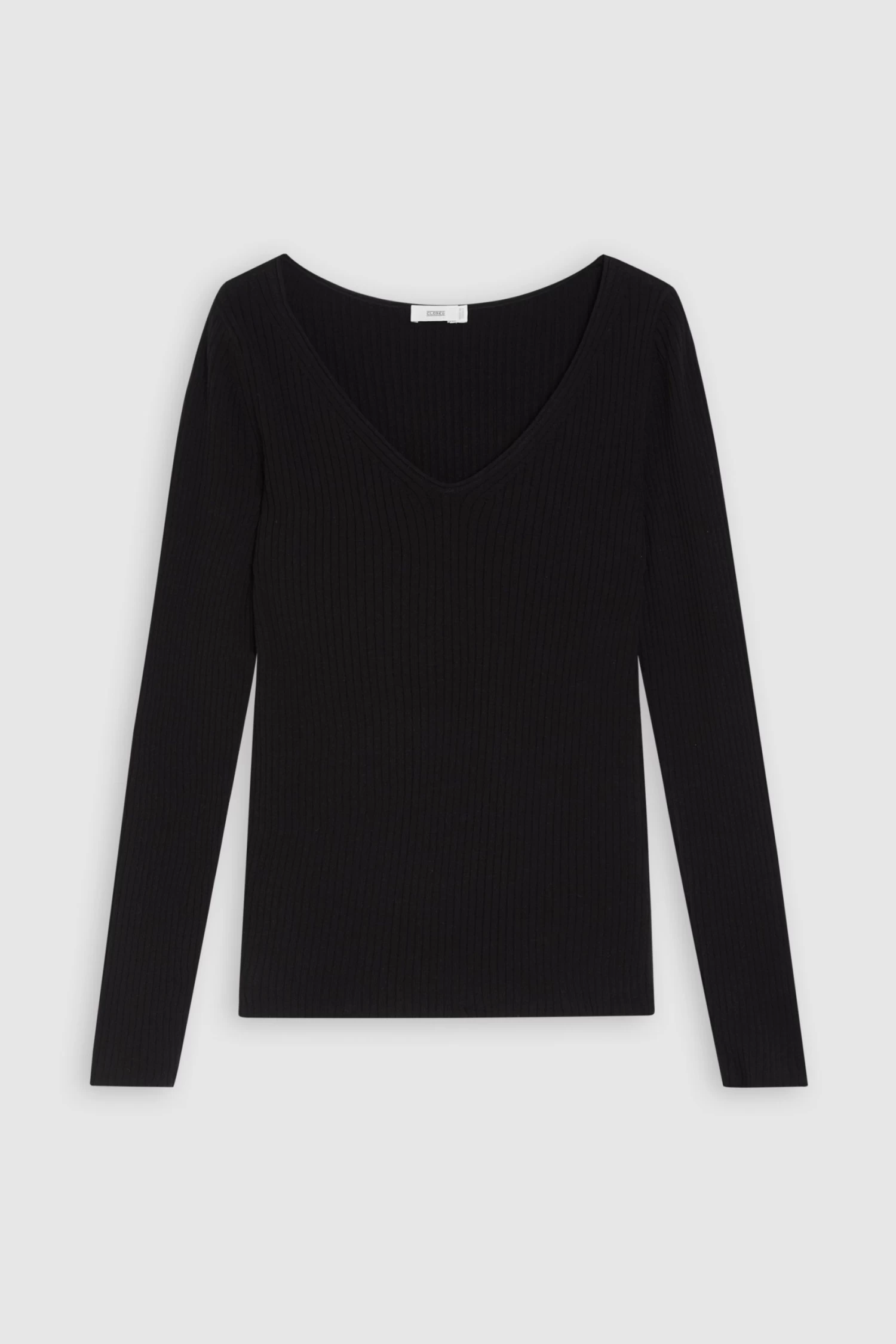 Slim Fit mit V-Ausschnitt im feinen Rippstrick. Gefertigt aus einer Bio-Baumwolle- und Viskosemischung mit softem Griff. Mit geradem Ärmel- und Saumabschluss.