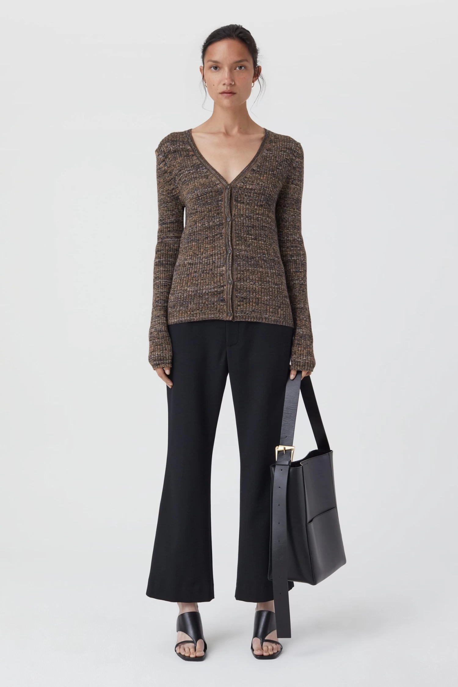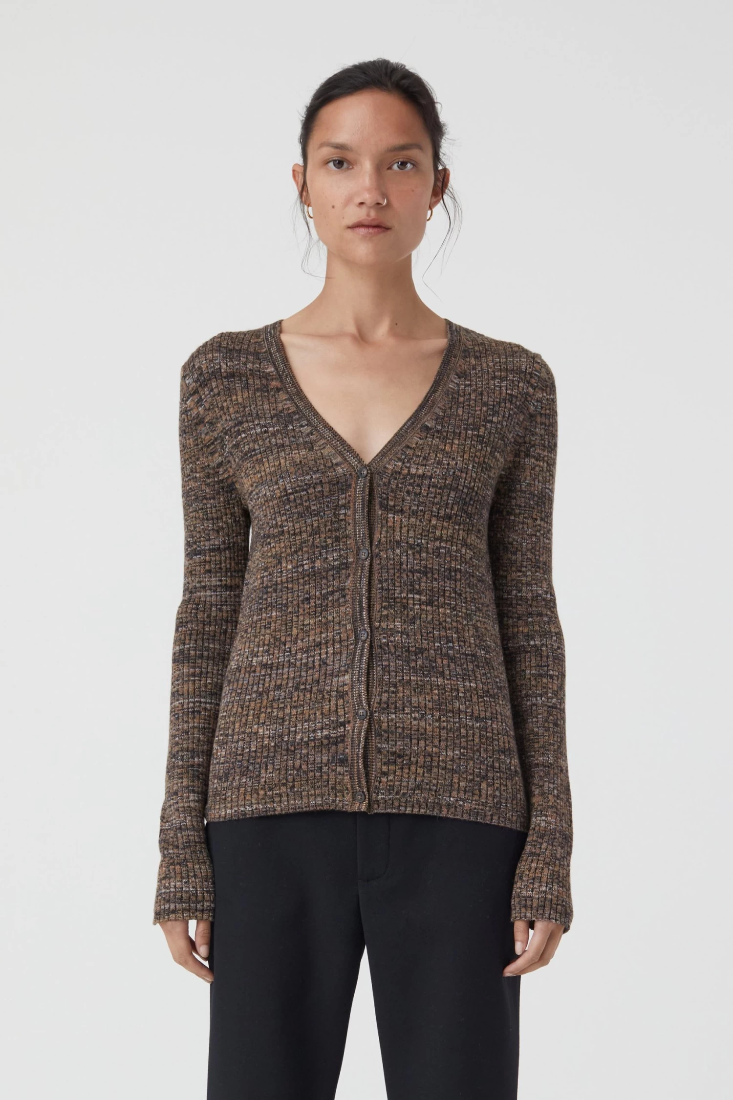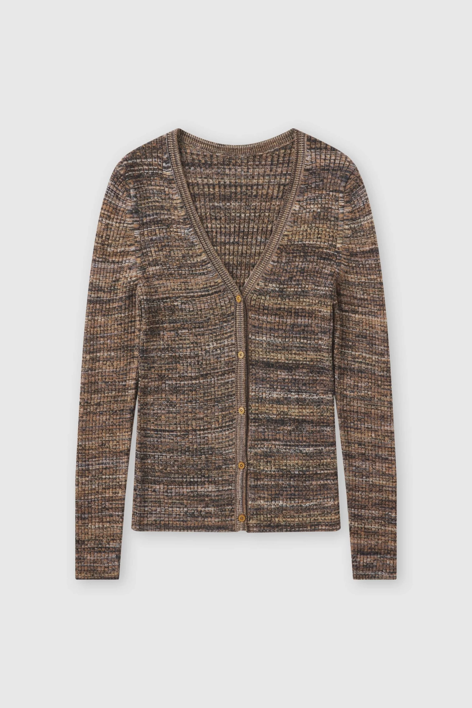 Die gerippte Struktur verleiht dem Cardigan im Slim Fit Elastizität. Gefertigt aus italienischem Garn mit mehrfarbigem Mouliné-Effekt. Hierbei werden beim Stricken der Artikel drei unterschiedlich farbige Garne eingesetzt, sodass zufällige Effekte und Muster entstehen. So wird jedes Teil zum Unikat.