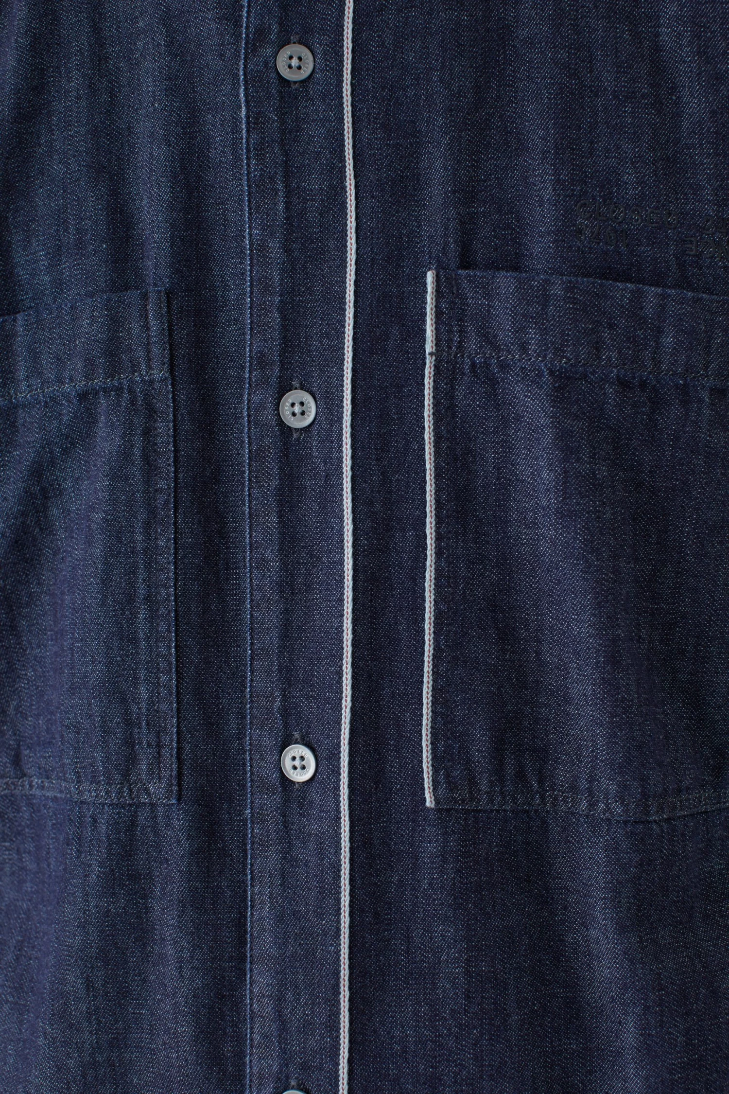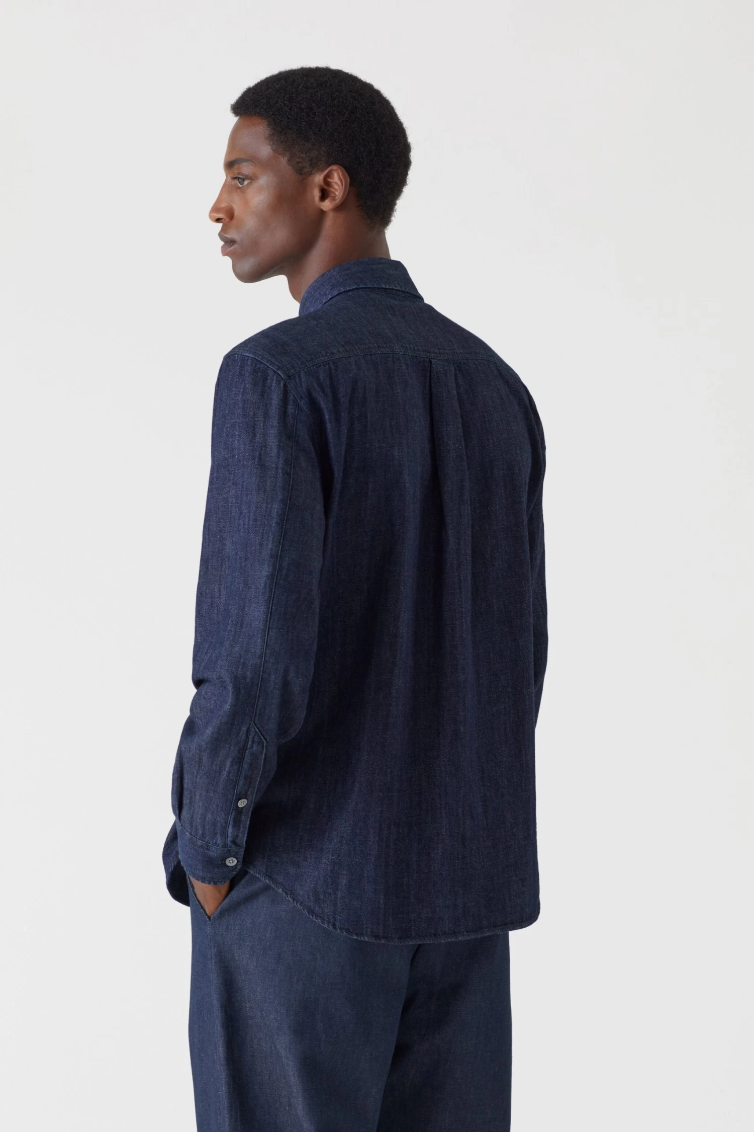 Hemd aus garngefärbtem italienischem Selvedge-Denim mit typischer Webkante an Knopfleiste und Brusttasche. Dunkle Waschung mit Kontrastknöpfen.
