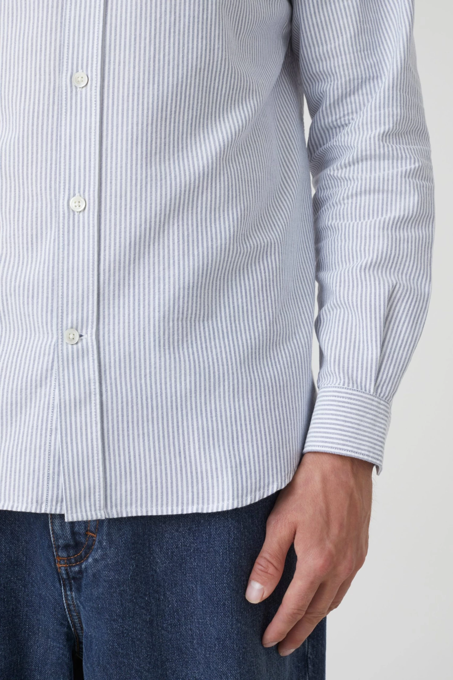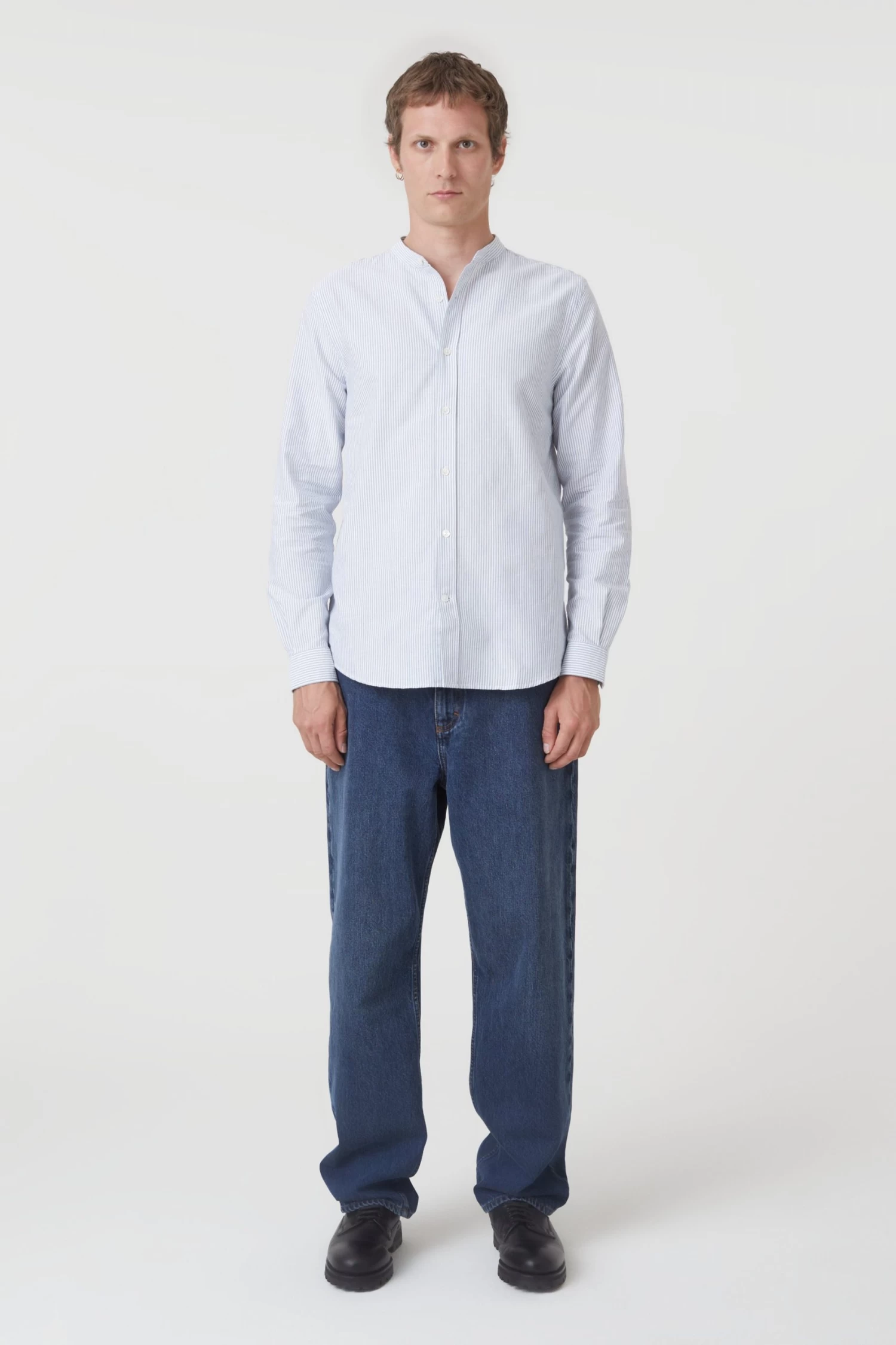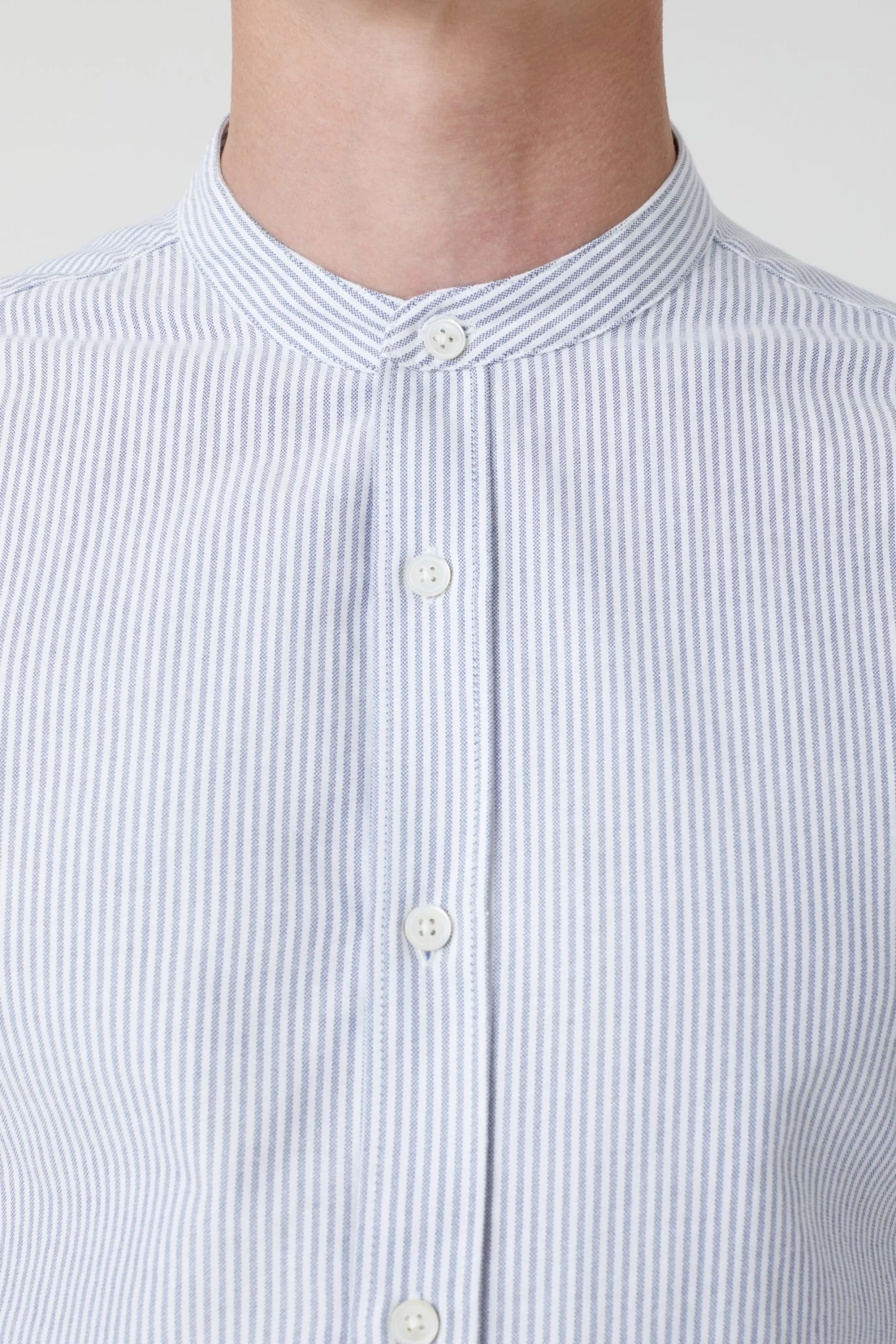 Hergestellt in Portugal, zeichnet sich unser Stehkragenhemd aus Baumwolle durch sein garngefärbtes Streifenmuster aus. Mit Perlmuttknöpfen und Manschetten an den Ärmelabschlüssen.