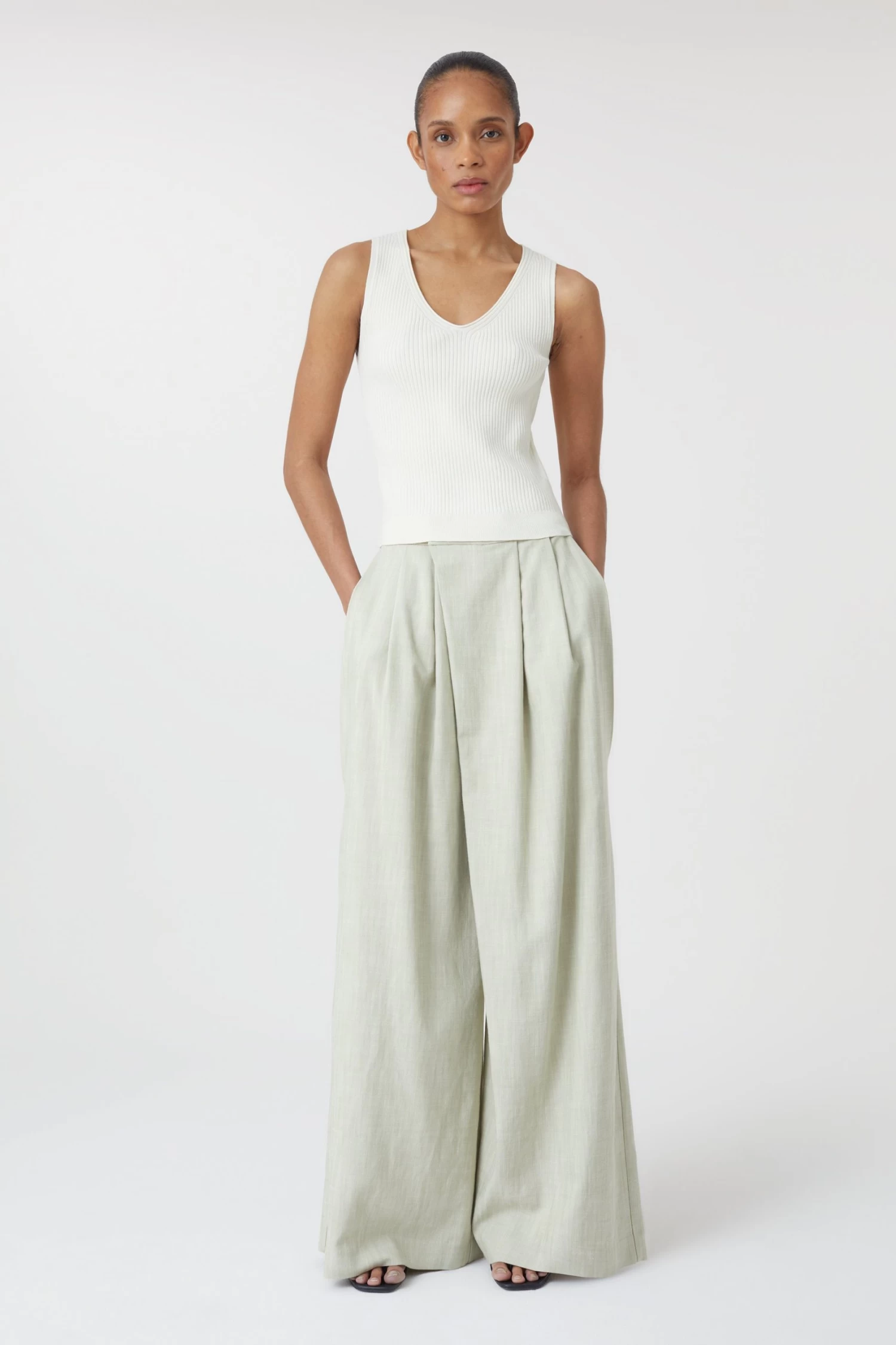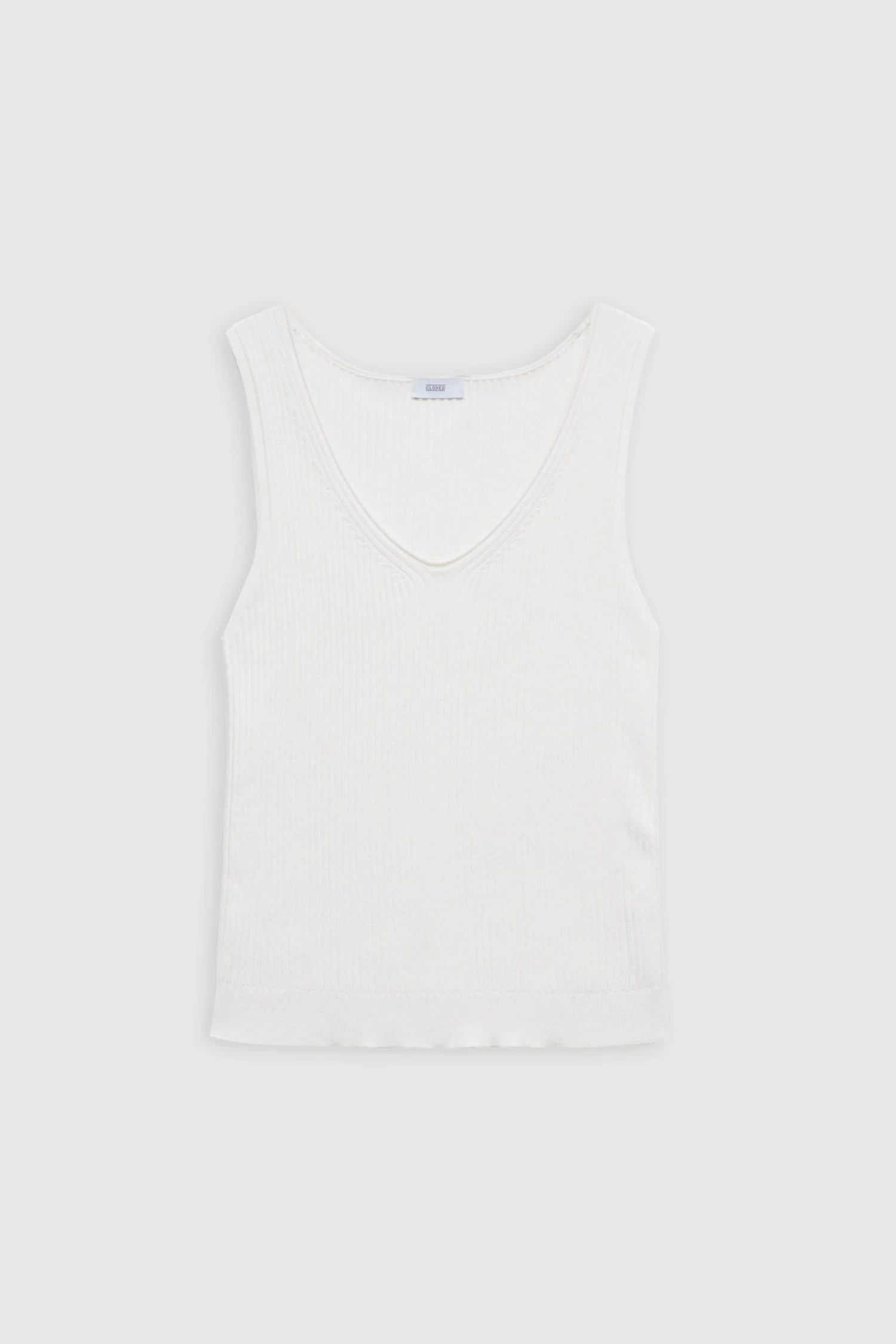 Geripptes Top im Slim Fit mit V-Neck, hergestellt aus einer Bio-Baumwoll- und Viskosemischung – weiche und elastische Qualität mit geradem Saumabschluss.