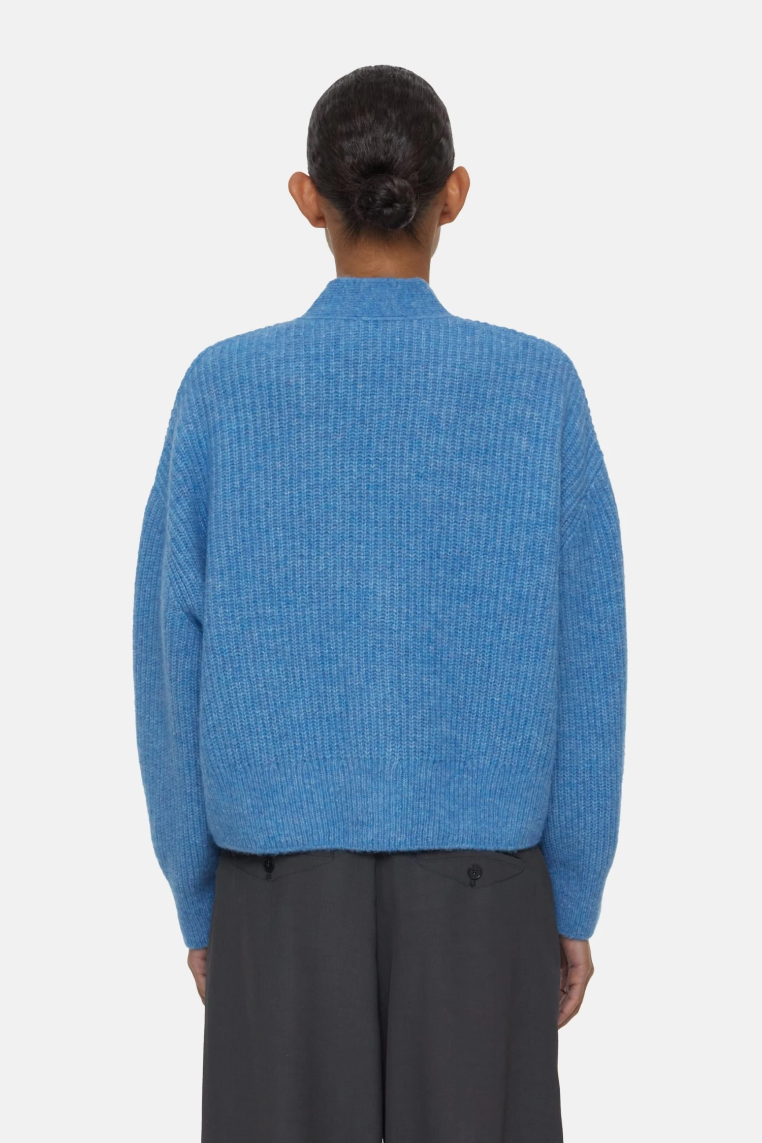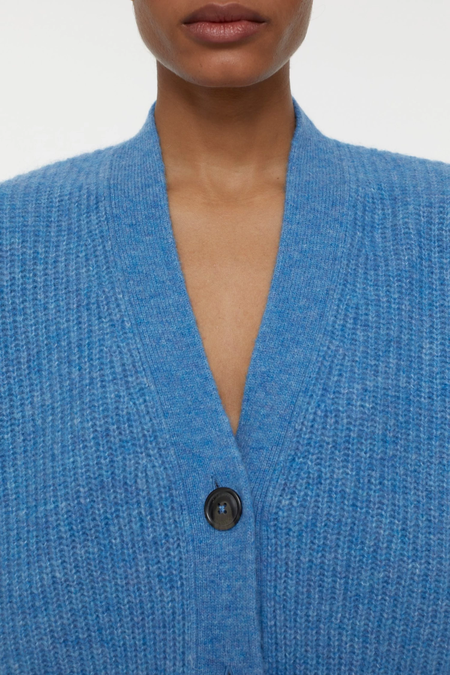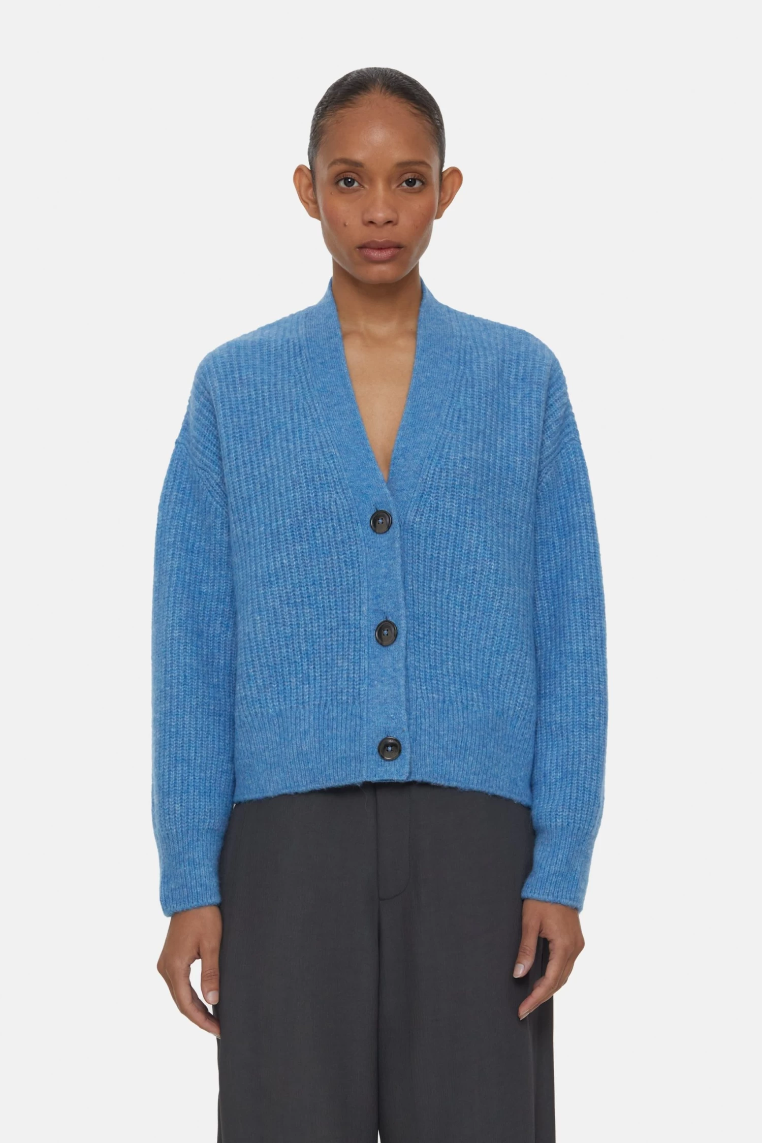 Aus weichem italienischem Alpaka-Mix-Garn im Fisherman’s Rib (7 gg): Cardigan in O-Form mit V-Ausschnitt und Knöpfen in Horn-Optik.