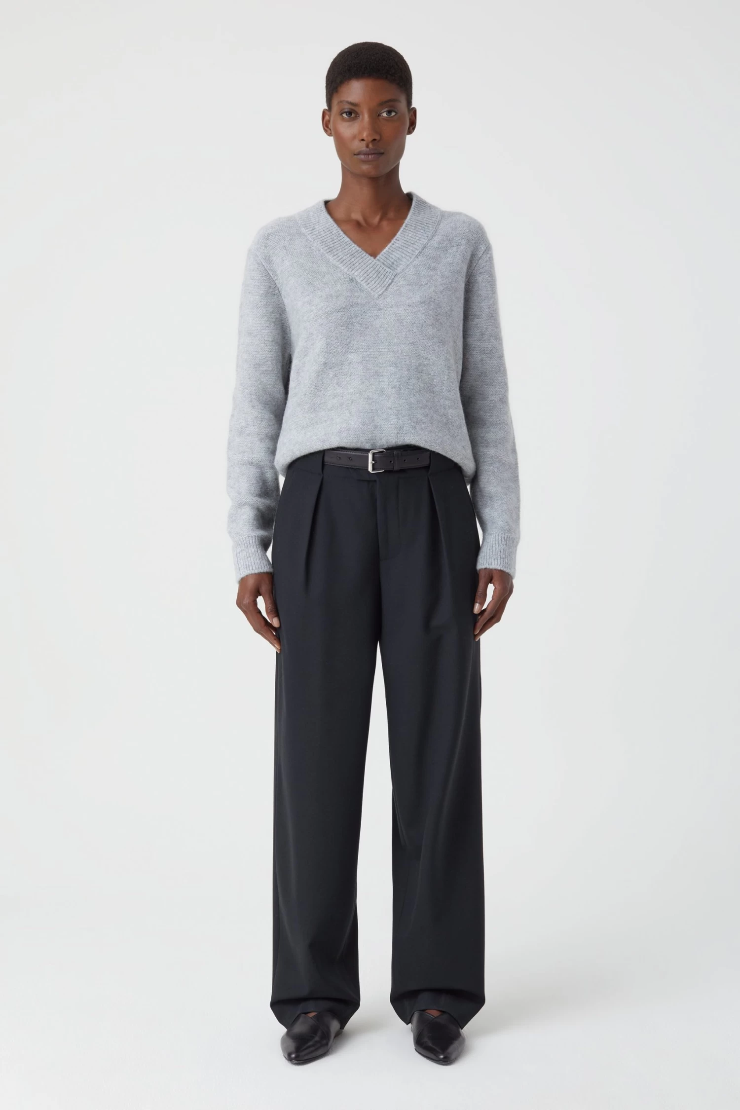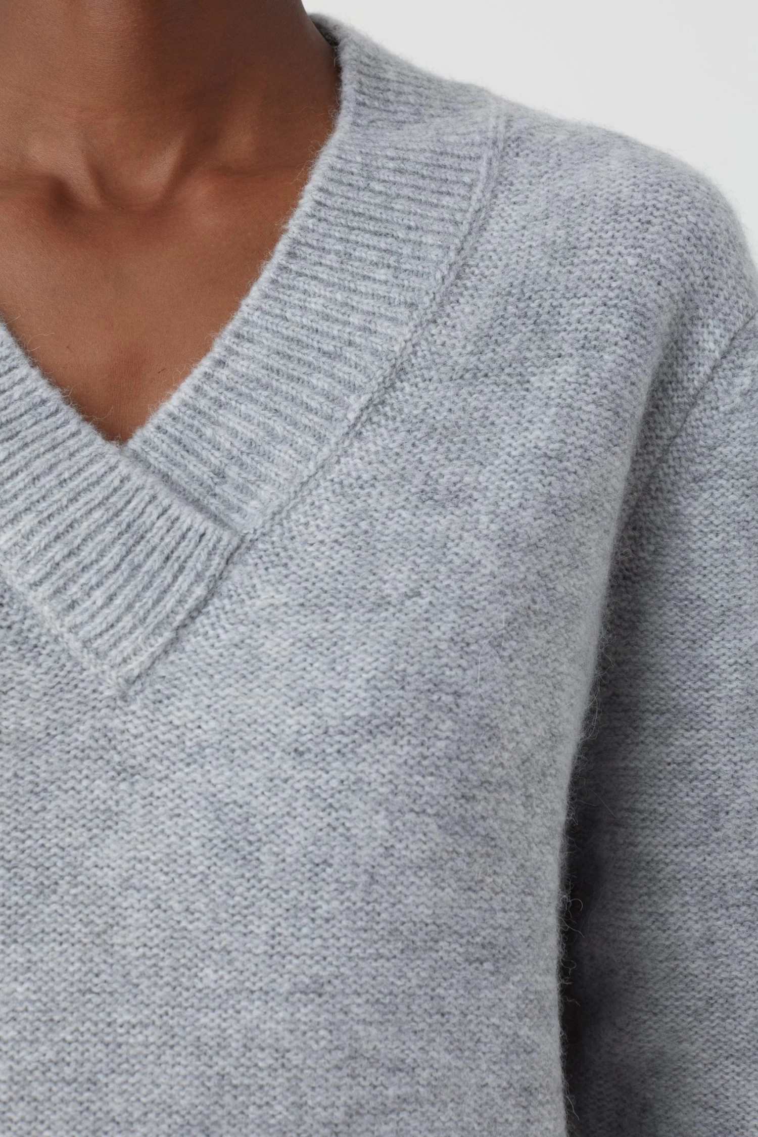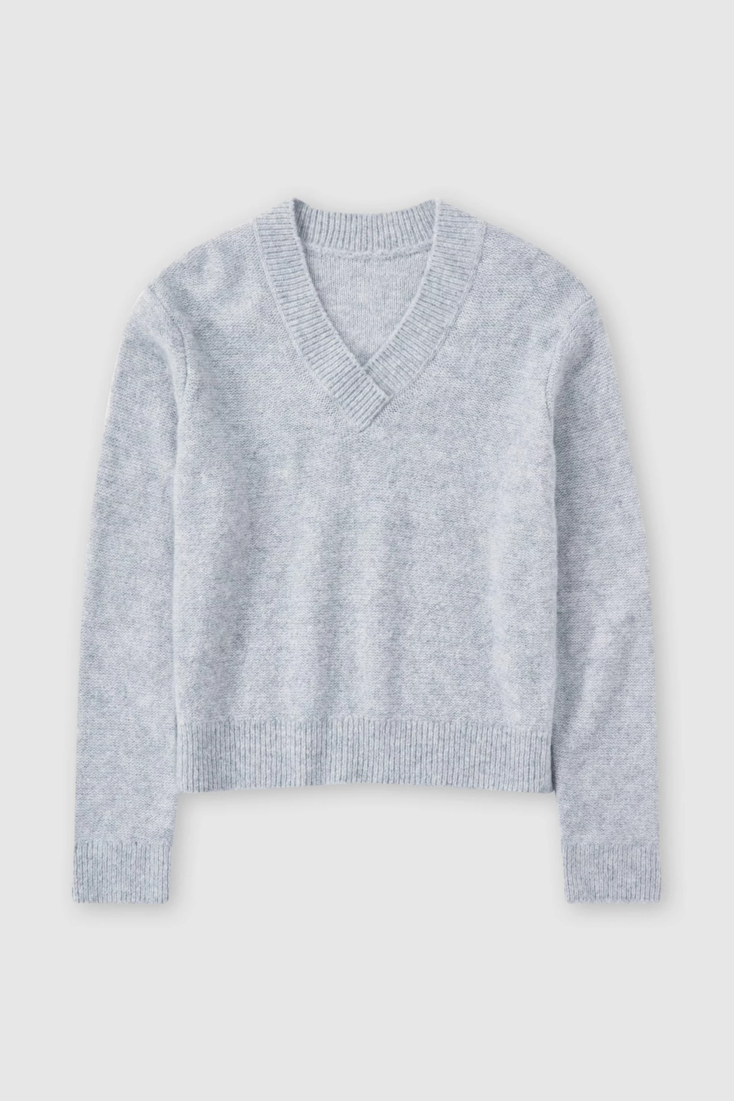 Im Regular Fit aus weichem italienischem Alpaka-Mix-Garn im mittelschweren Strick (7 gg): V-Pullover mit linker Warenseite außen und gerippten Büdchen.