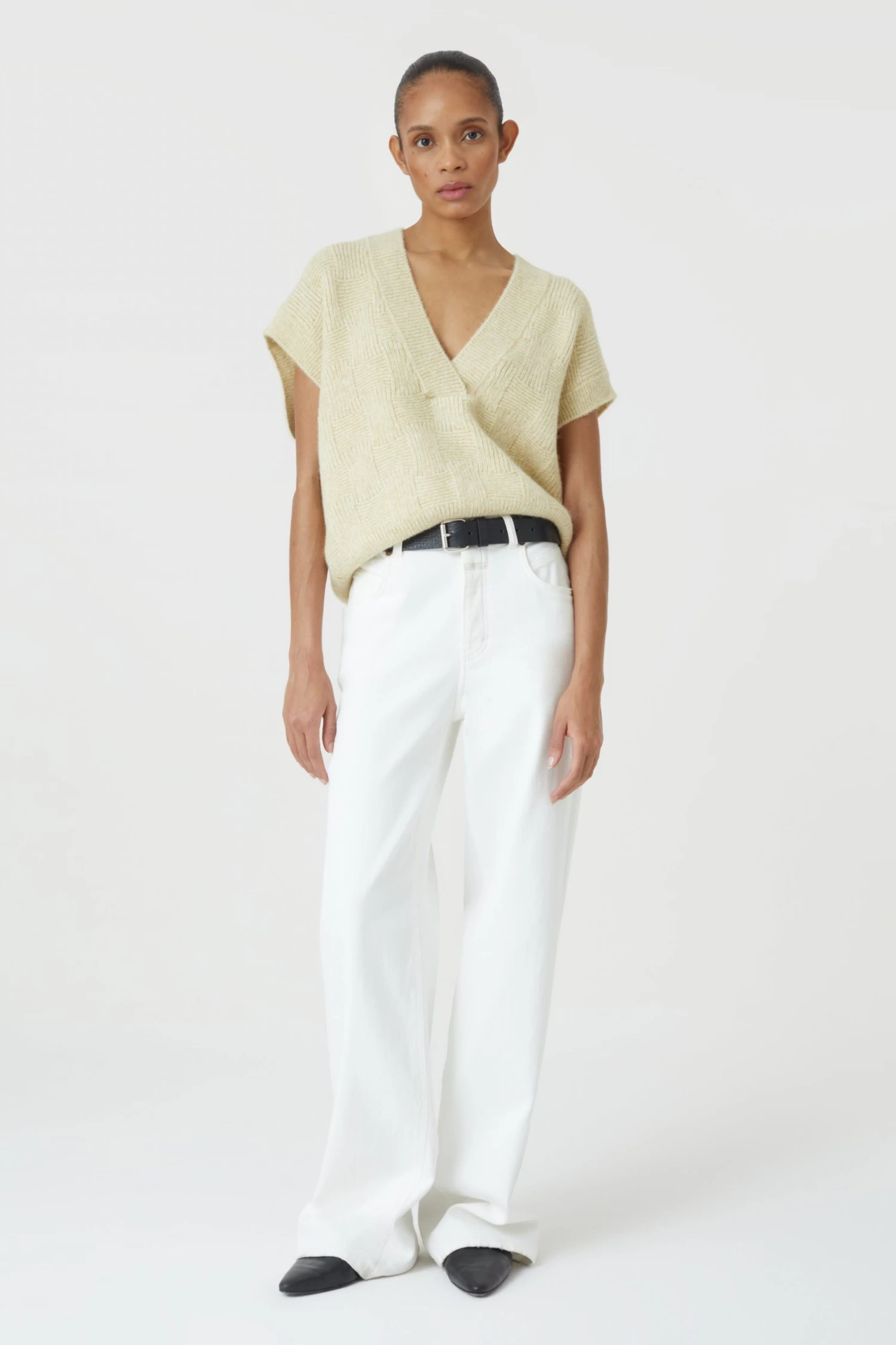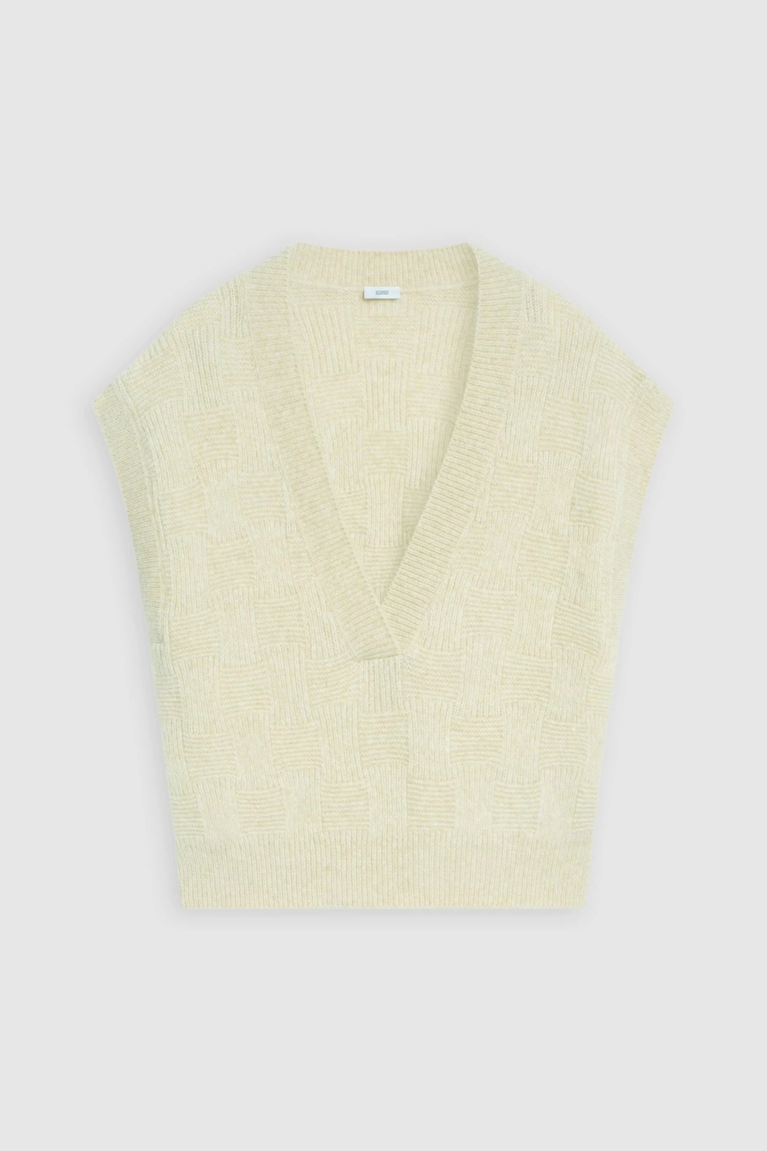 V-Pullunder mit Schachbrettmuster aus unterschiedlich gestricktem Alpaka-Mix-Garn – gesponnen im italienischen Traditionsbetrieb Pecci Filati. Boxy Fit mit breitem Bündchen am V-Ausschnitt.
